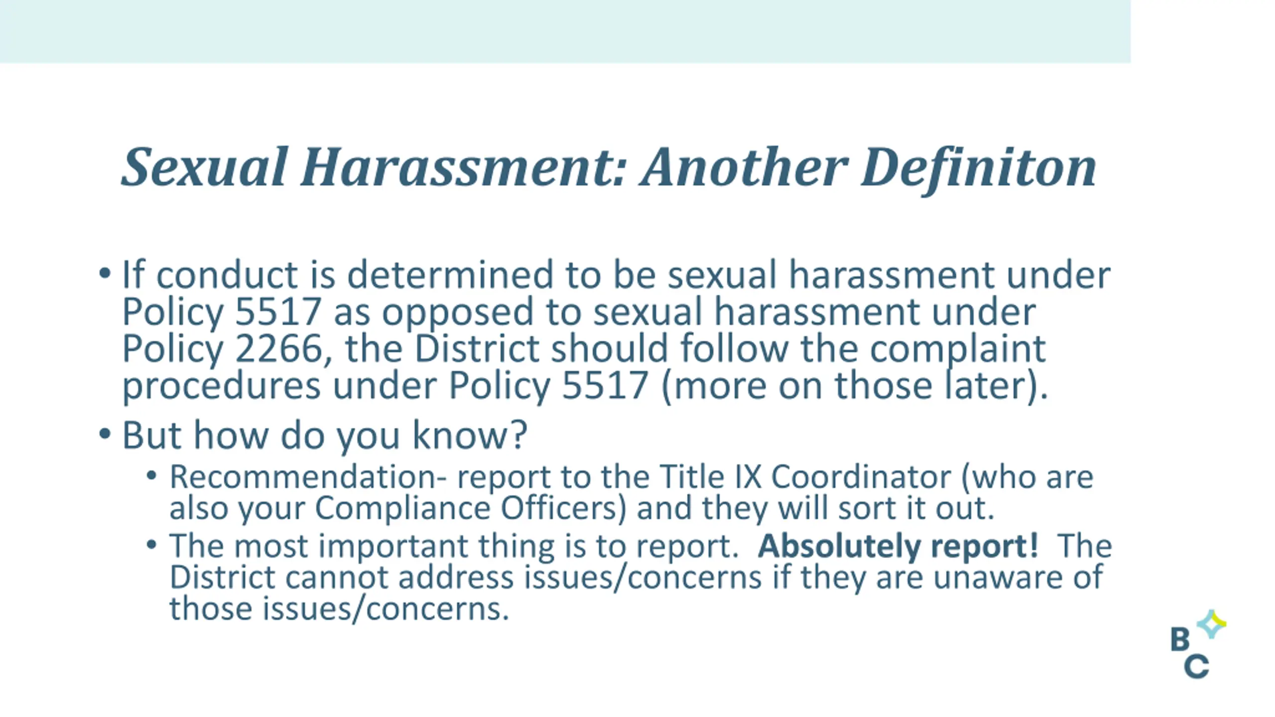 Sexual Harassment: Another Definiton If conduct is determined to be sexual harassment under Policy 5517 as opposed to sexual harassment under Policy 2266, the District should follow the complaint procedures under Policy 5517 (more on those later). But how do you know? Recommendation- report to the Title IX Coordinator (who are also your Compliance Officers) and they will sort it out. The most important thing is to report. Absolutely report! The District cannot address issues/concerns if they are unaware of those issues/concerns.
