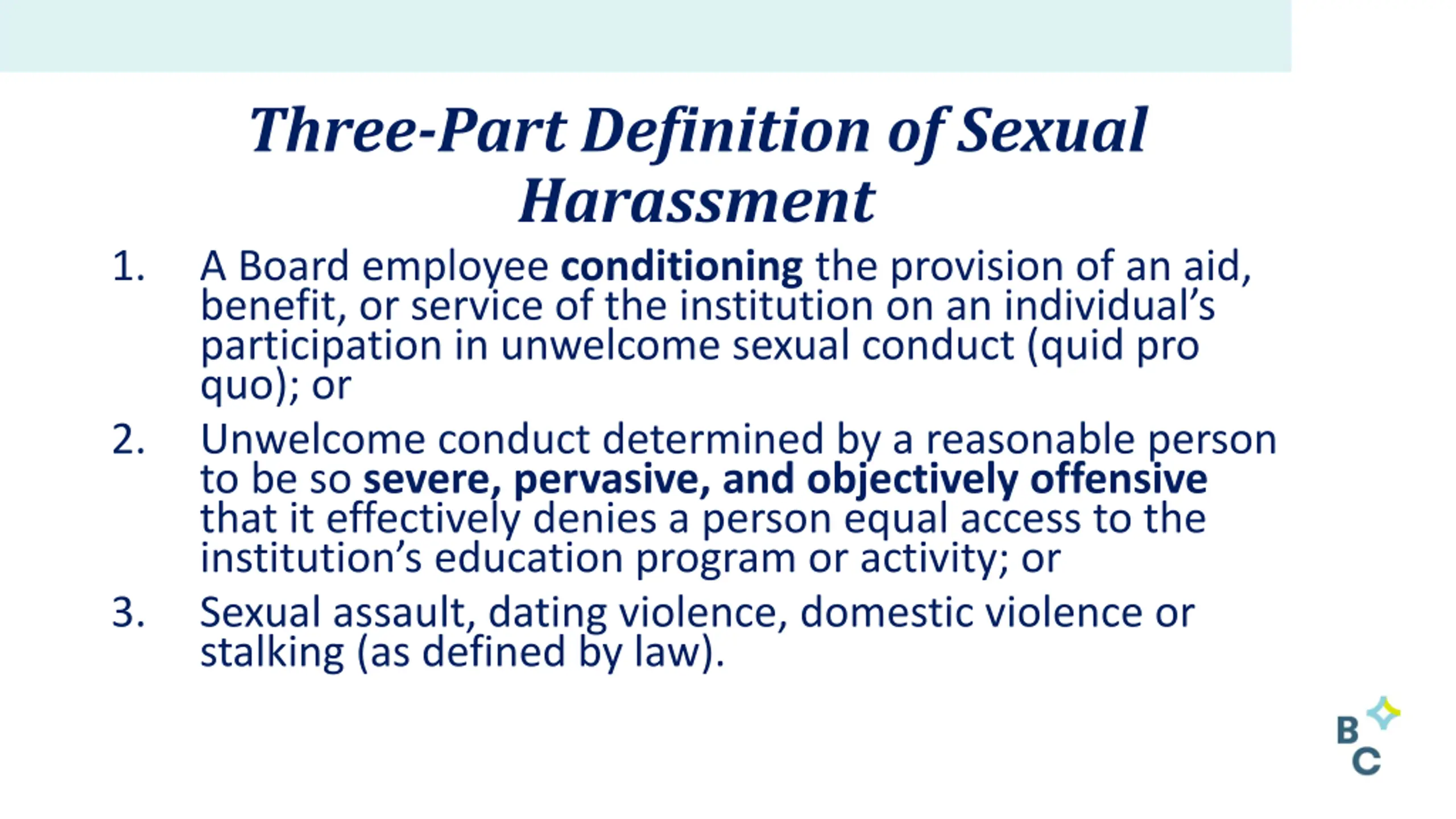 Three-Part Definition of Sexual Harassment A Board employee conditioning the provision of an aid, benefit, or service of the institution on an individual s participation in unwelcome sexual conduct (quid pro quo); or Unwelcome conduct determined by a reasonable person to be so severe, pervasive, and objectively offensive that it effectively denies a person equal access to the institution s education program or activity; or Sexual assault, dating violence, domestic violence or stalking (as defined by law). 1. 2. 3.