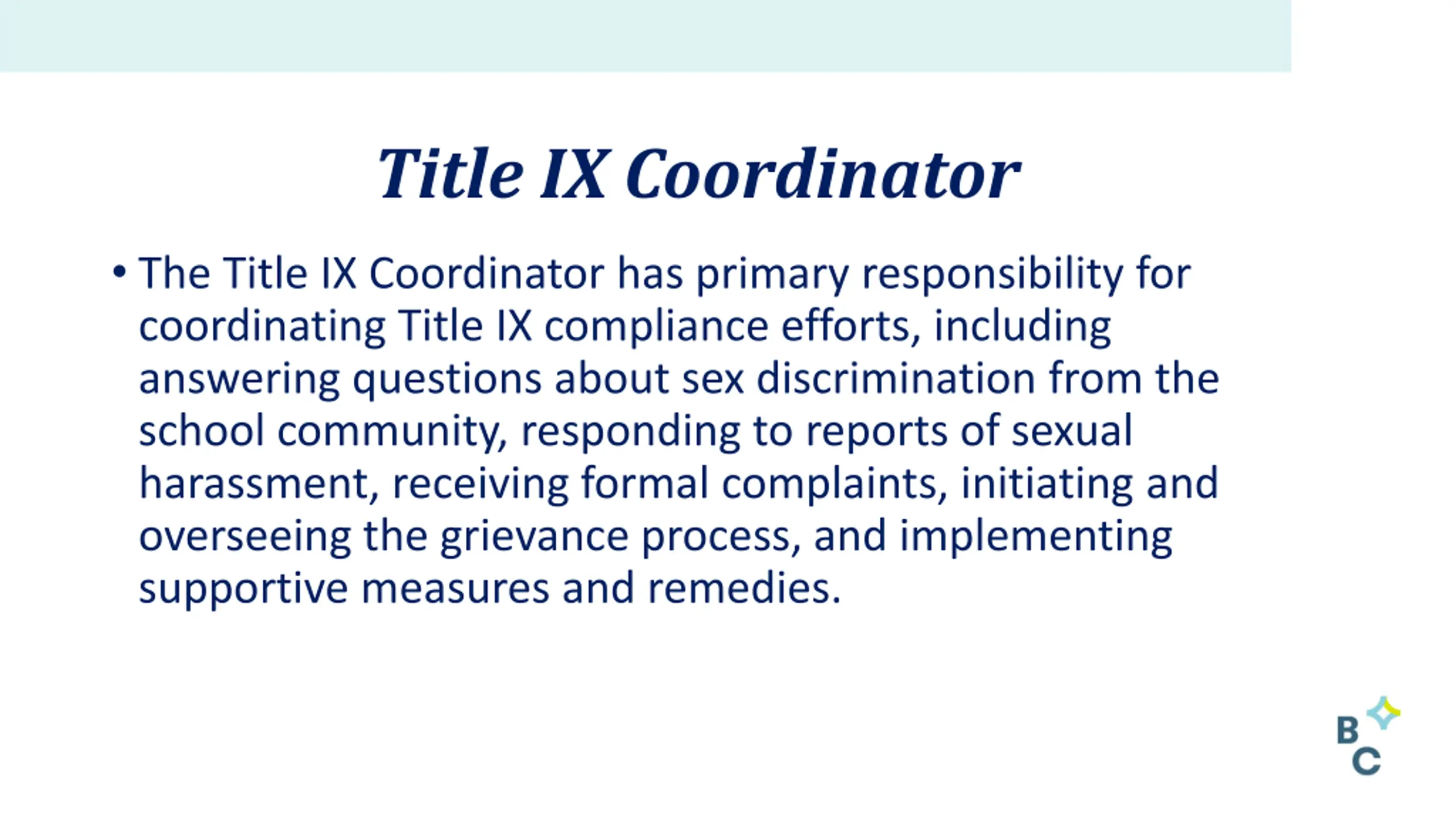 Title IX Coordinator The Title IX Coordinator has primary responsibility for coordinating Title IX compliance efforts, including answering questions about sex discrimination from the school community, responding to reports of sexual harassment, receiving formal complaints, initiating and overseeing the grievance process, and implementing supportive measures and remedies.