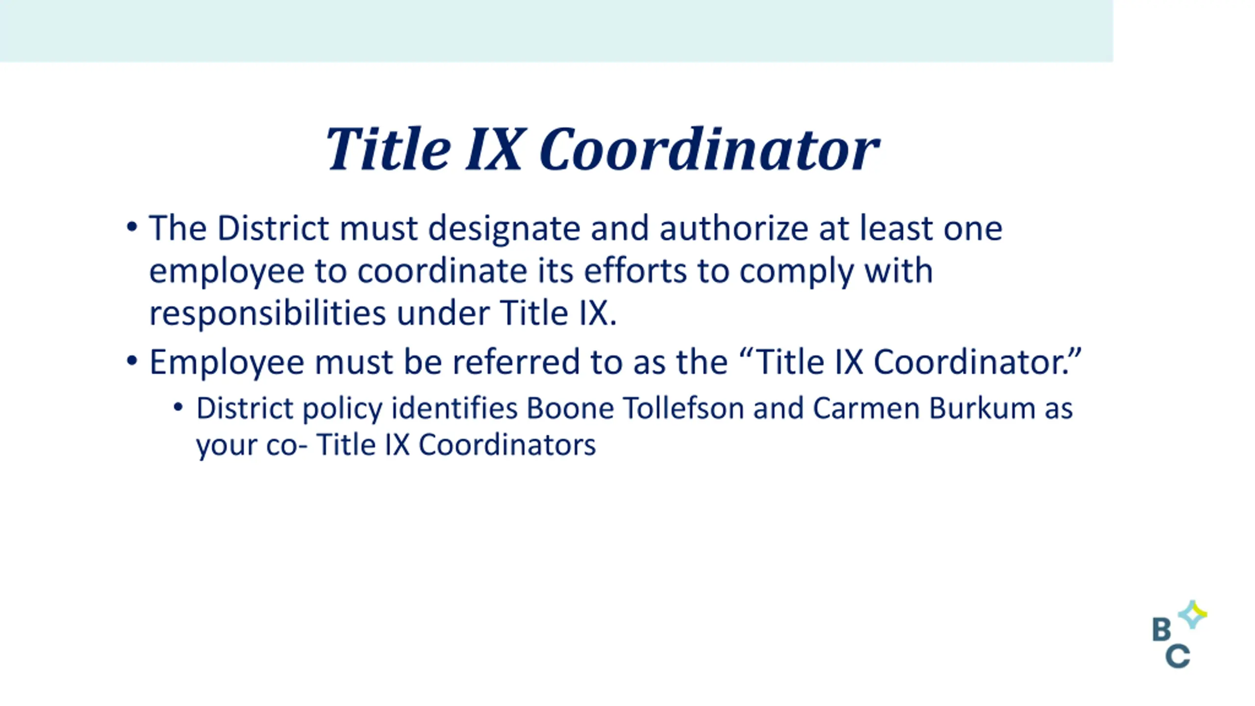 Title IX Coordinator The District must designate and authorize at least one employee to coordinate its efforts to comply with responsibilities under Title IX. Employee must be referred to as the Title IX Coordinator. District policy identifies Boone Tollefson and Carmen Burkum as your co- Title IX Coordinators