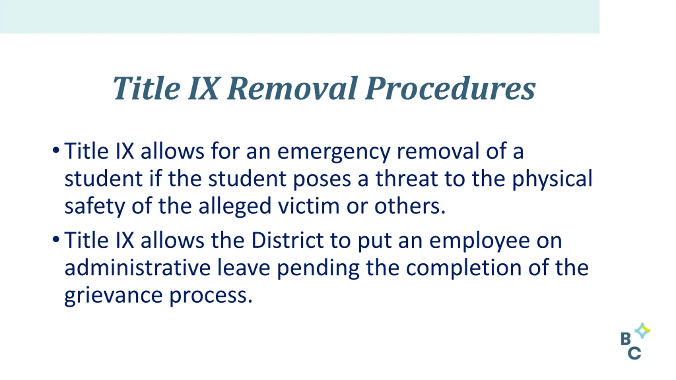 Title IX Removal Procedures Title IX allows for an emergency removal of a student if the student poses a threat to the physical safety of the alleged victim or others. Title IX allows the District to put an employee on administrative leave pending the completion of the grievance process.