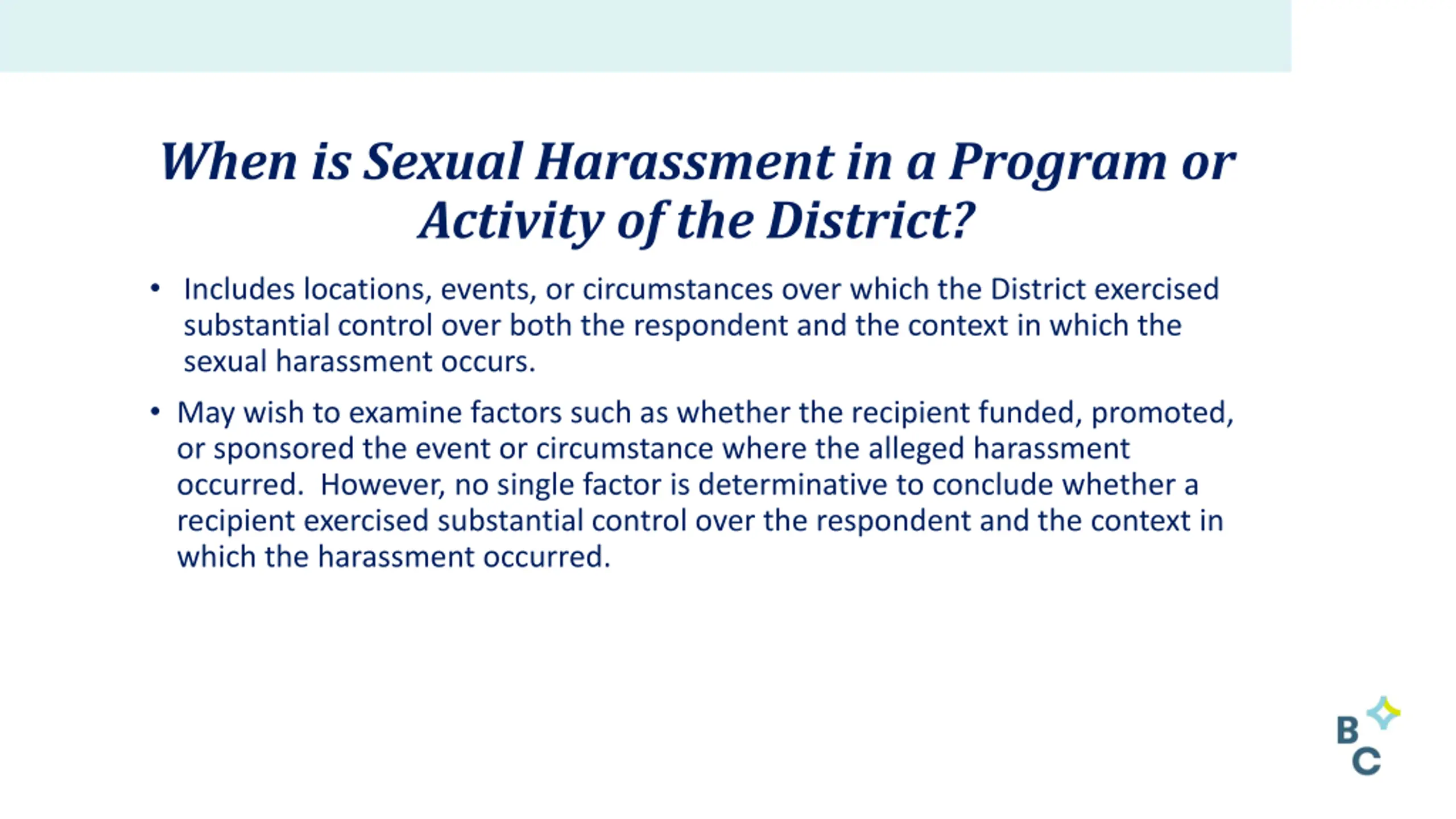 When is Sexual Harassment in a Program or Activity of the District? Includes locations, events, or circumstances over which the District exercised substantial control over both the respondent and the context in which the sexual harassment occurs. May wish to examine factors such as whether the recipient funded, promoted, or sponsored the event or circumstance where the alleged harassment occurred. However, no single factor is determinative to conclude whether a recipient exercised substantial control over the respondent and the context in which the harassment occurred.