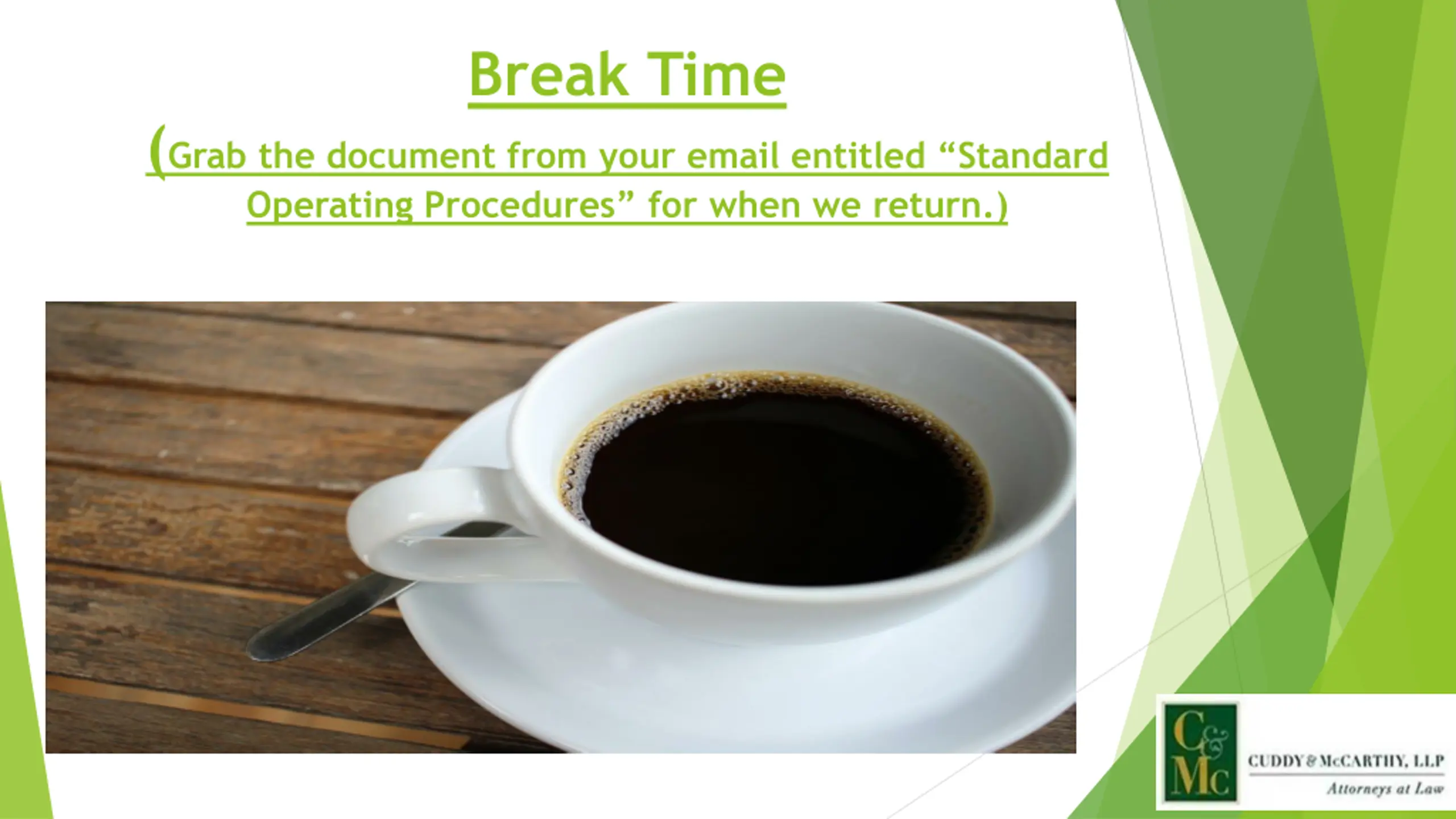 Break Time (Grab the document from your email entitled Standard Operating Procedures for when we return.)