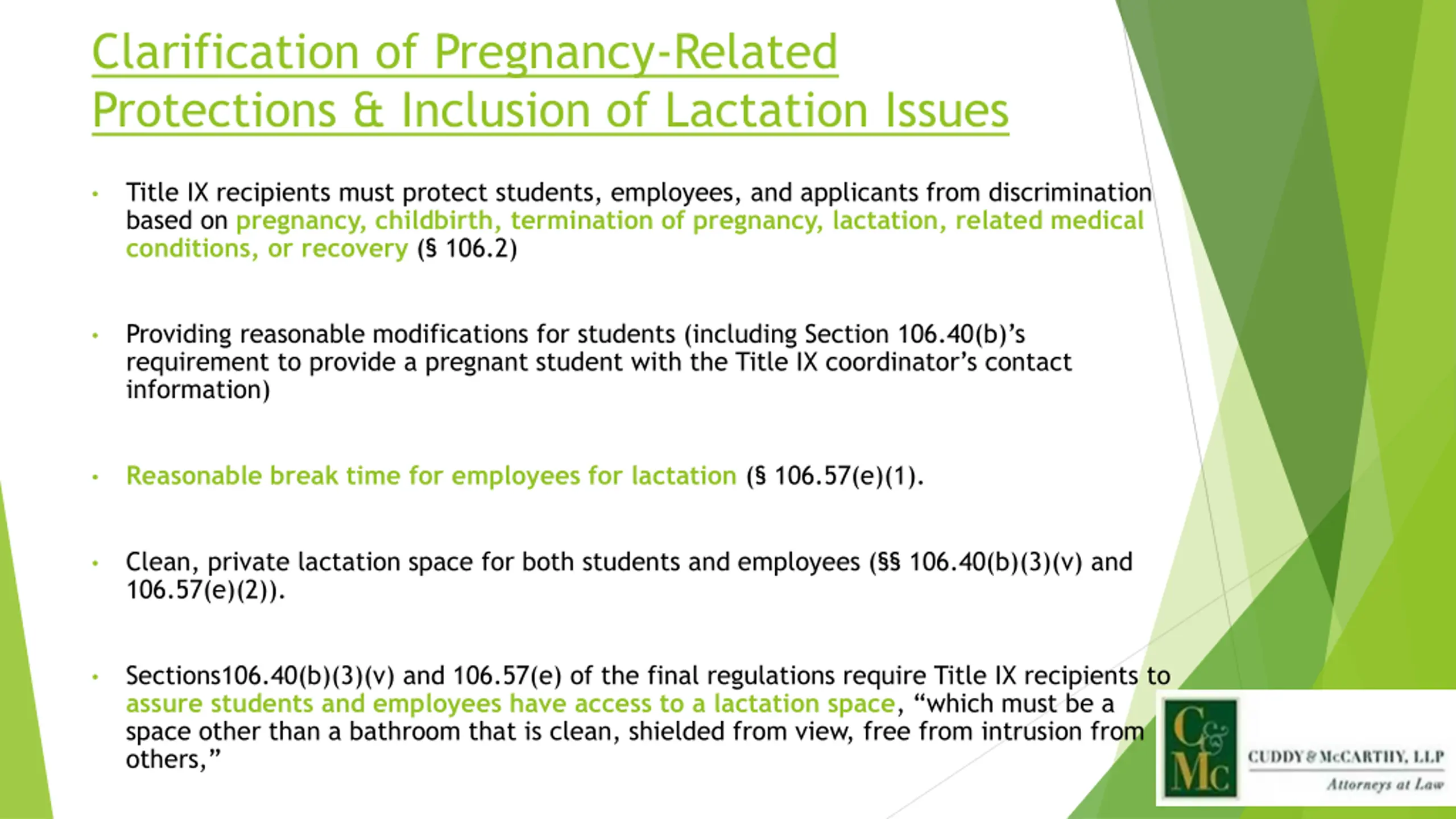 Clarification of Pregnancy-Related Protections & Inclusion of Lactation Issues Title IX recipients must protect students, employees, and applicants from discrimination based on pregnancy, childbirth, termination of pregnancy, lactation, related medical conditions, or recovery ( 106.2) Providing reasonable modifications for students (including Section 106.40(b) s requirement to provide a pregnant student with the Title IX coordinator s contact information) Reasonable break time for employees for lactation ( 106.57(e)(1). Clean, private lactation space for both students and employees ( 106.40(b)(3)(v) and 106.57(e)(2)). Sections106.40(b)(3)(v) and 106.57(e) of the final regulations require Title IX recipients to assure students and employees have access to a lactation space, which must be a space other than a bathroom that is clean, shielded from view, free from intrusion from others,