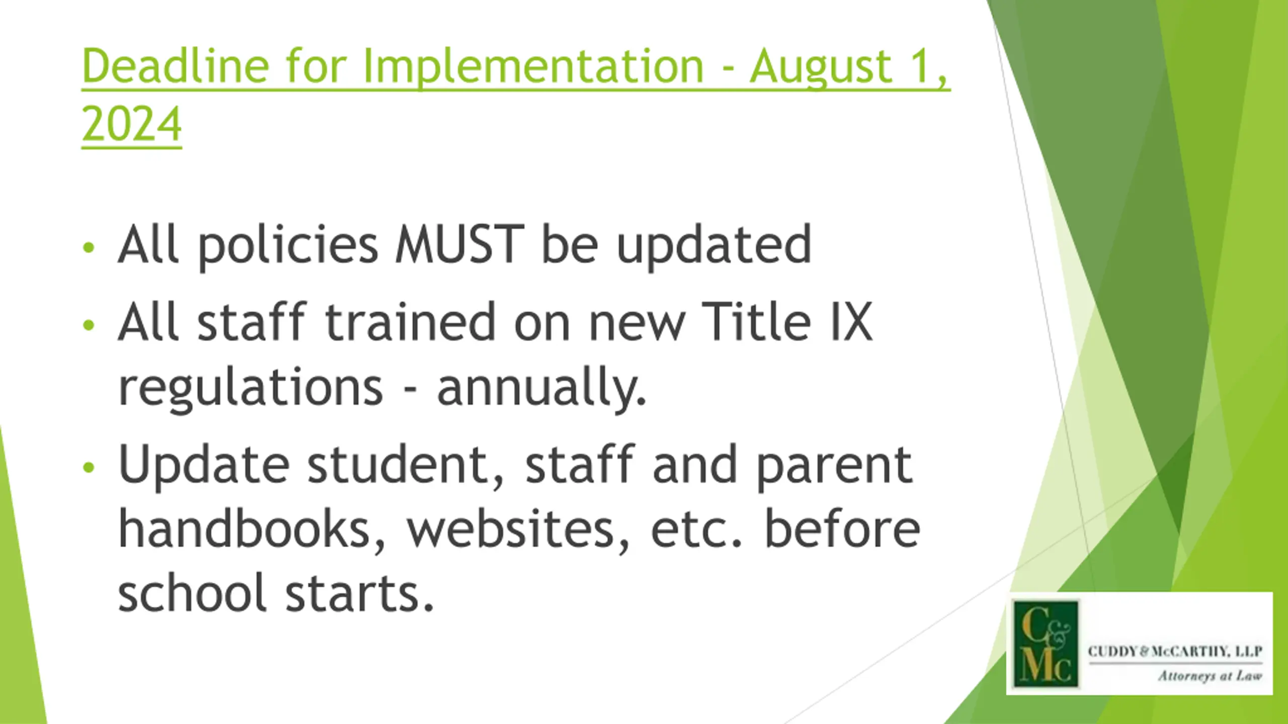 Deadline for Implementation - August 1, 2024 All policies MUST be updated All staff trained on new Title IX regulations - annually. Update student, staff and parent handbooks, websites, etc. before school starts.