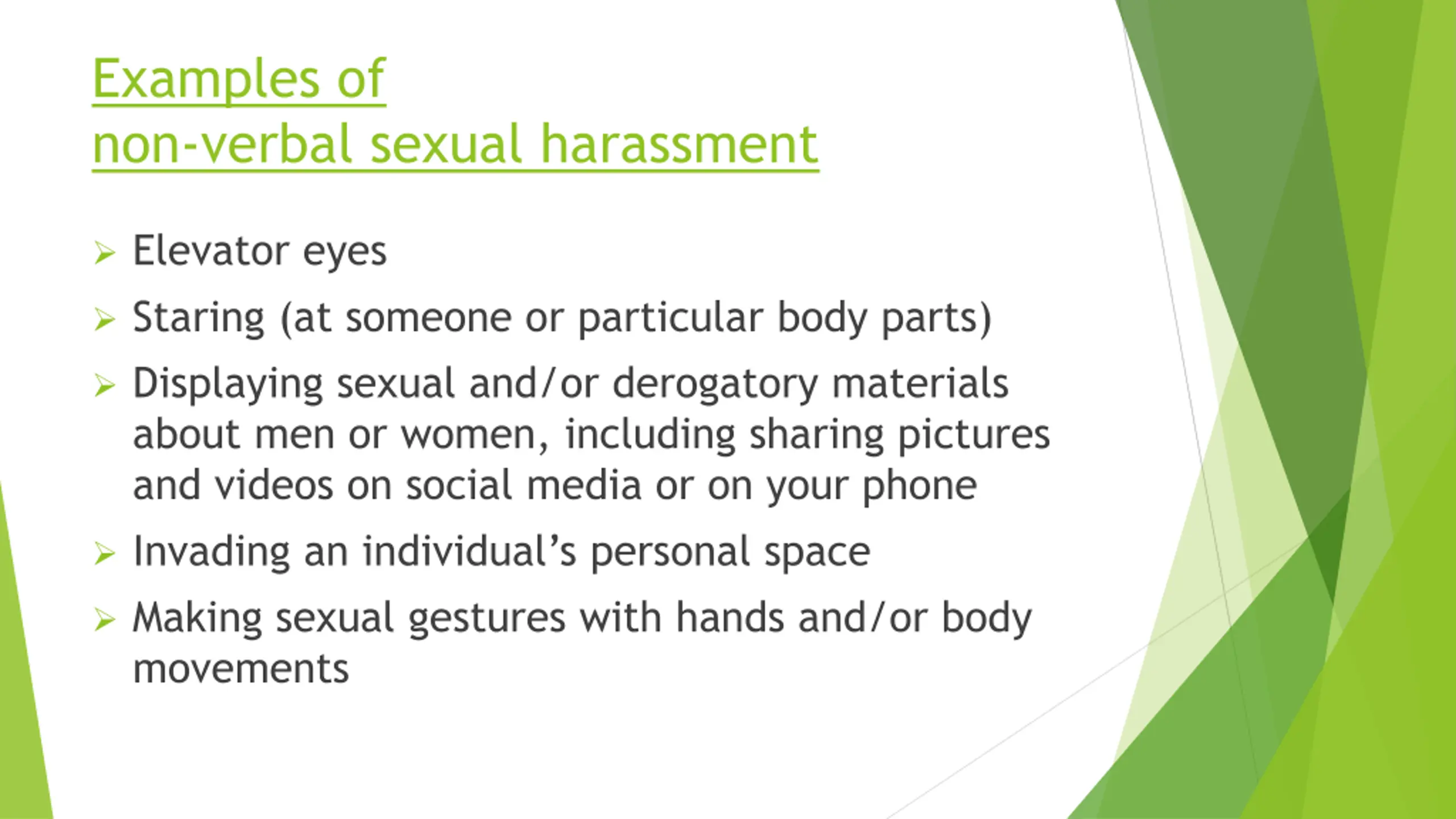 Examples of non-verbal sexual harassment Elevator eyes Staring (at someone or particular body parts) Displaying sexual and/or derogatory materials about men or women, including sharing pictures and videos on social media or on your phone Invading an individual s personal space Making sexual gestures with hands and/or body movements