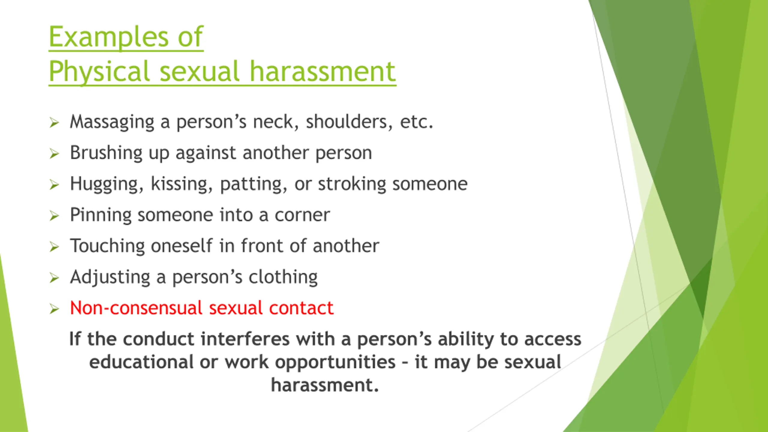 Examples of Physical sexual harassment Massaging a person s neck, shoulders, etc. Brushing up against another person Hugging, kissing, patting, or stroking someone Pinning someone into a corner Touching oneself in front of another Adjusting a person s clothing Non-consensual sexual contact If the conduct interferes with a person s ability to access educational or work opportunities it may be sexual harassment.