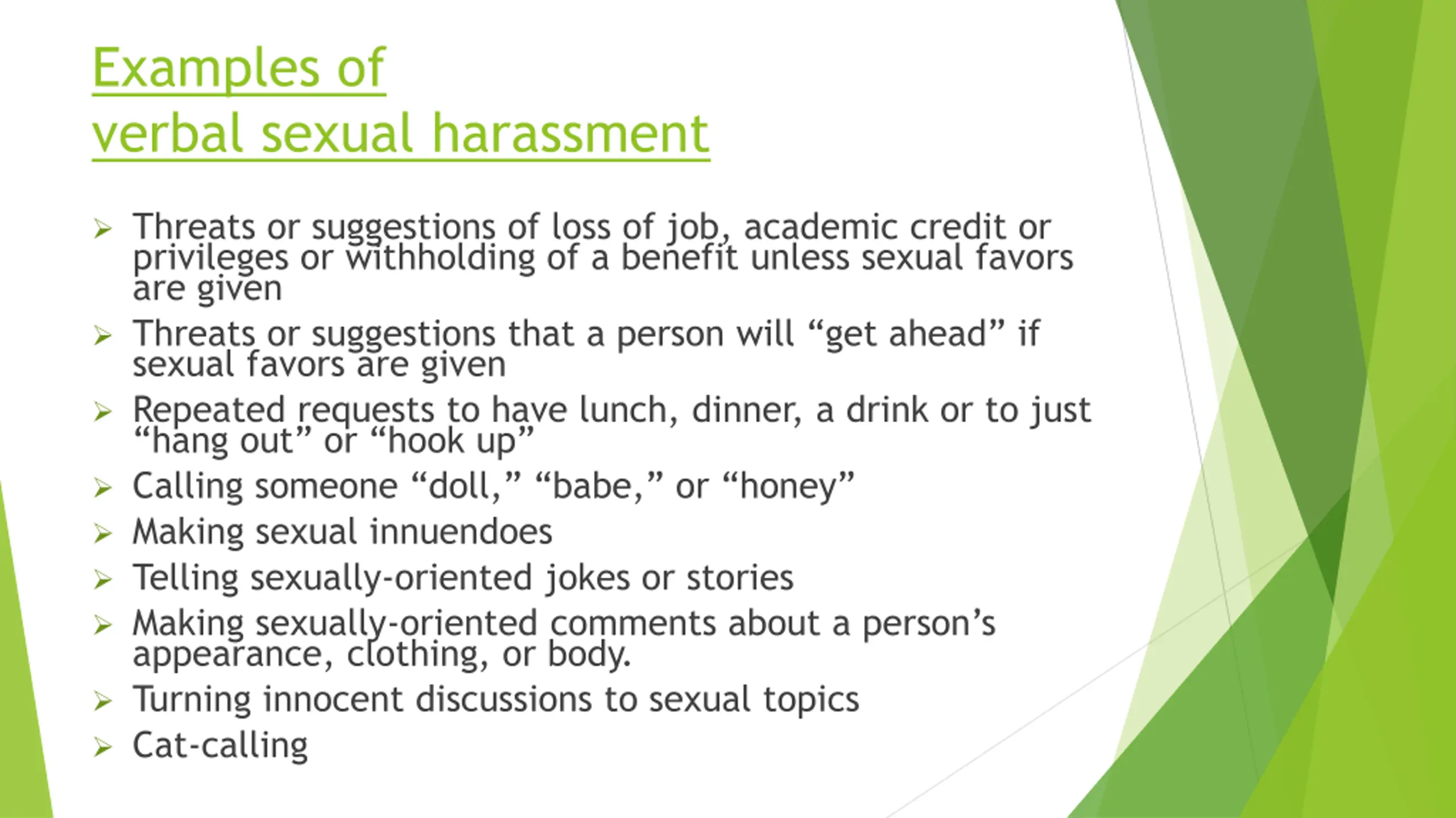 Examples of verbal sexual harassment Threats or suggestions of loss of job, academic credit or privileges or withholding of a benefit unless sexual favors are given Threats or suggestions that a person will get ahead if sexual favors are given Repeated requests to have lunch, dinner, a drink or to just hang out or hook up Calling someone doll, babe, or honey Making sexual innuendoes Telling sexually-oriented jokes or stories Making sexually-oriented comments about a person s appearance, clothing, or body. Turning innocent discussions to sexual topics Cat-calling