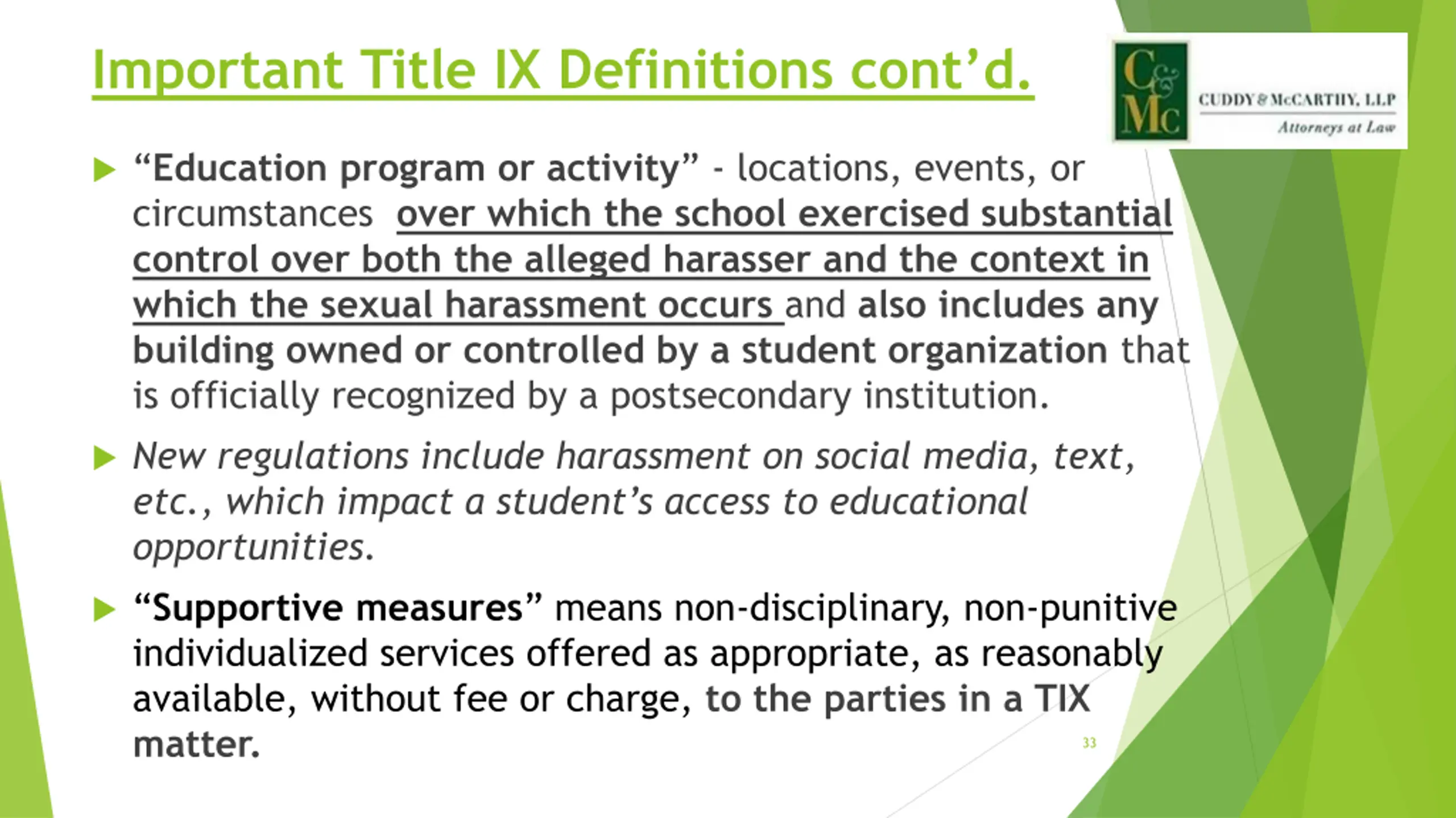 Important Title IX Definitions contd. Education program or activity - locations, events, or circumstances over which the school exercised substantial control over both the alleged harasser and the context in which the sexual harassment occurs and also includes any building owned or controlled by a student organization that is officially recognized by a postsecondary institution. New regulations include harassment on social media, text, etc., which impact a student s access to educational opportunities. Supportive measures means non-disciplinary, non-punitive individualized services offered as appropriate, as reasonably available, without fee or charge, to the parties in a TIX matter. 33