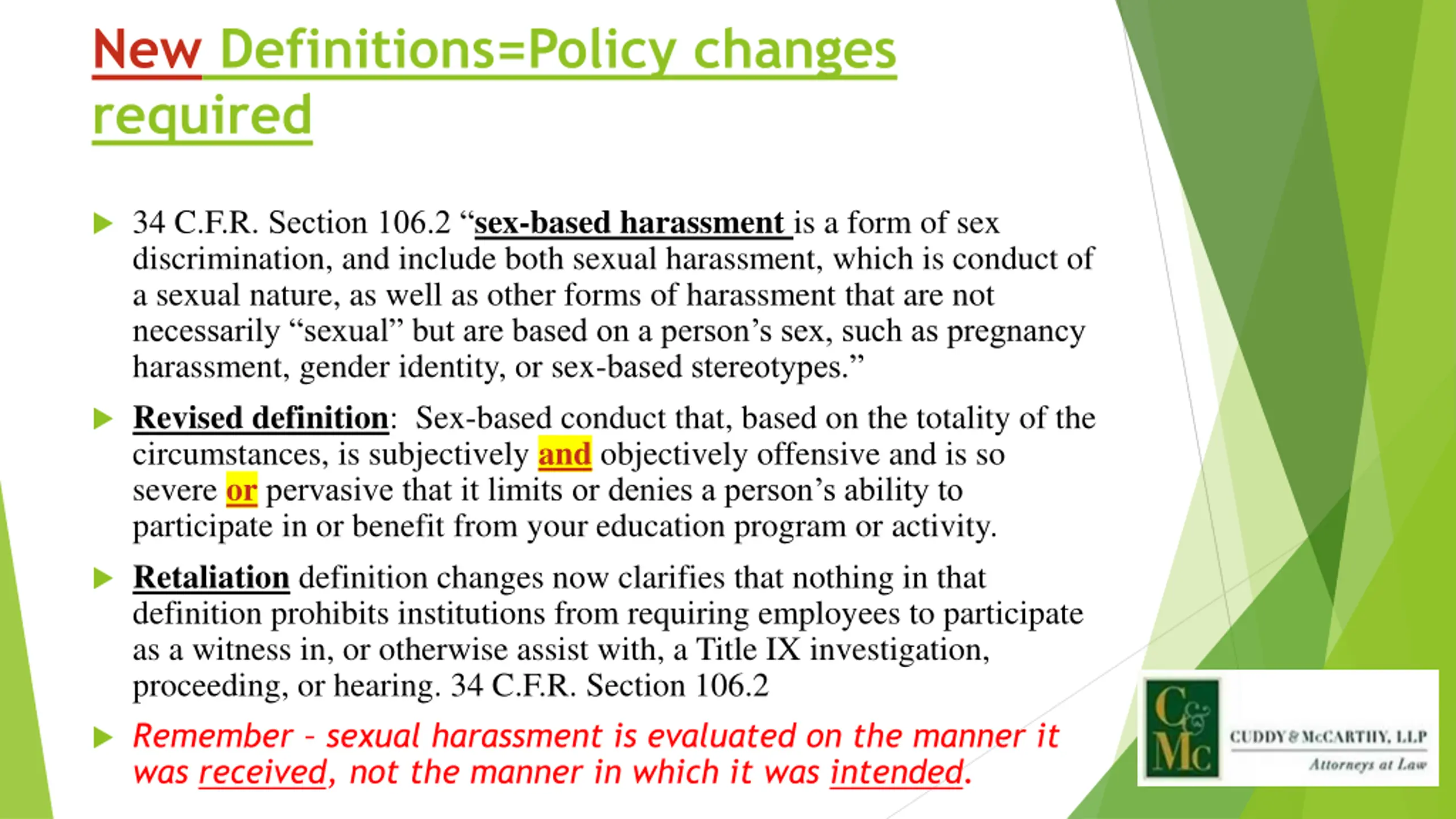 New Definitions=Policy changes required 34 C.F.R. Section 106.2 sex-based harassment is a form of sex discrimination, and include both sexual harassment, which is conduct of a sexual nature, as well as other forms of harassment that are not necessarily sexual but are based on a person s sex, such as pregnancy harassment, gender identity, or sex-based stereotypes. Revised definition: Sex-based conduct that, based on the totality of the circumstances, is subjectively and objectively offensive and is so severe orpervasive that it limits or denies a person s ability to participate in or benefit from your education program or activity. Retaliation definition changes now clarifies that nothing in that definition prohibits institutions from requiring employees to participate as a witness in, or otherwise assist with, a Title IX investigation, proceeding, or hearing. 34 C.F.R. Section 106.2 Remember sexual harassment is evaluated on the manner it was received, not the manner in which it was intended.