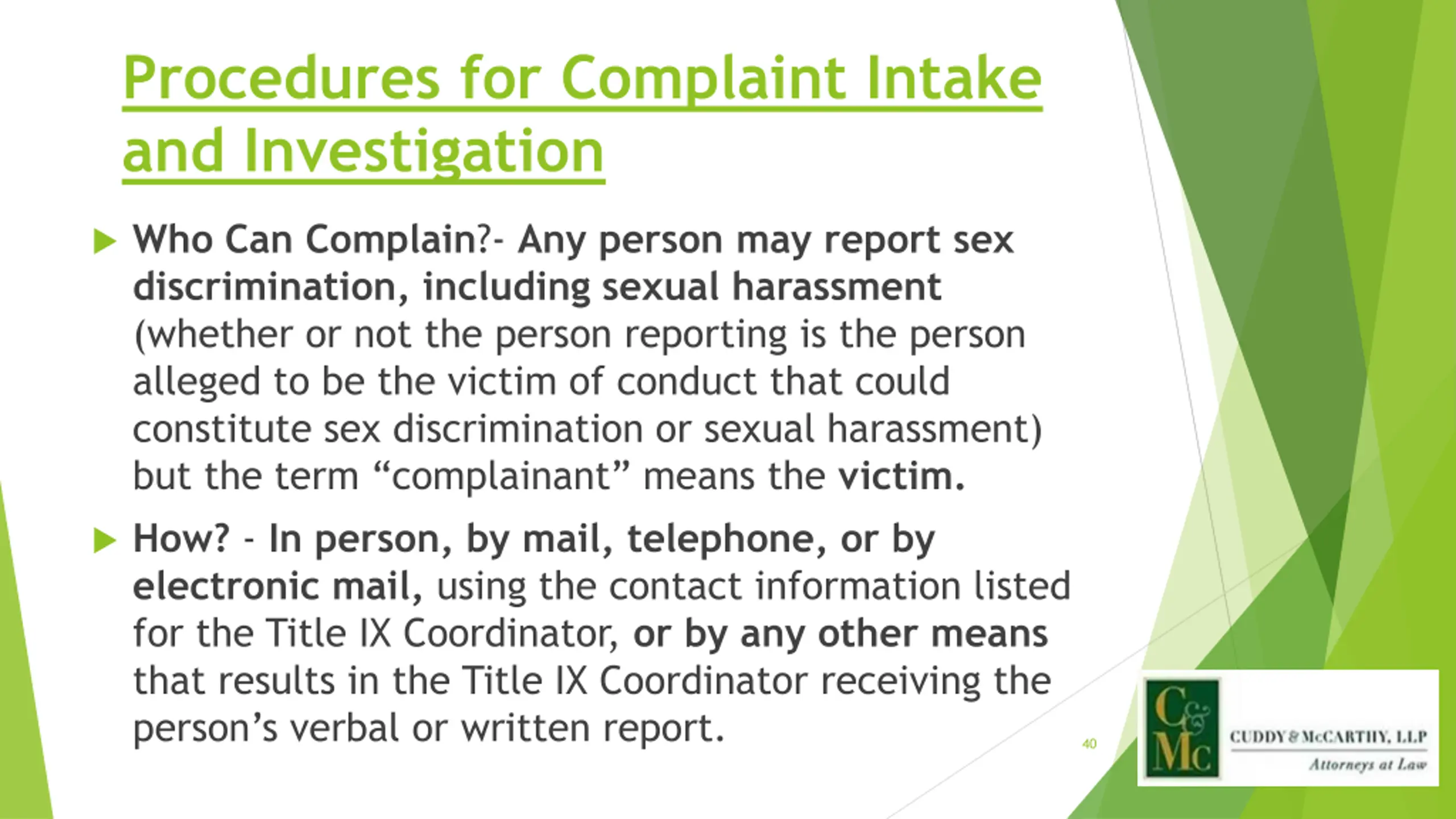 Procedures for Complaint Intake and Investigation Who Can Complain?- Any person may report sex discrimination, including sexual harassment (whether or not the person reporting is the person alleged to be the victim of conduct that could constitute sex discrimination or sexual harassment) but the term complainant means the victim. How? - In person, by mail, telephone, or by electronic mail, using the contact information listed for the Title IX Coordinator, or by any other means that results in the Title IX Coordinator receiving the person s verbal or written report. 40