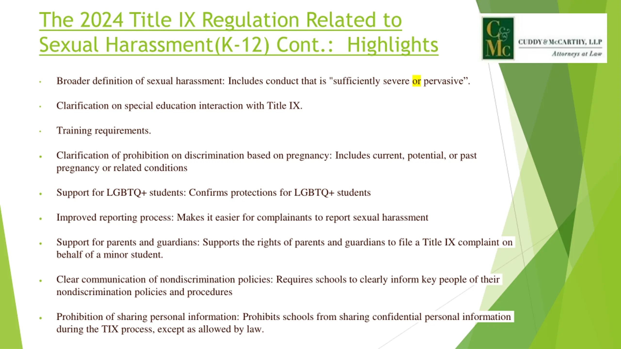 The 2024 Title IX Regulation Related to Sexual Harassment(K-12) Cont.: Highlights Broader definition of sexual harassment: Includes conduct that is "sufficiently severe or pervasive . Clarification on special education interaction with Title IX. Training requirements. Clarification of prohibition on discrimination based on pregnancy: Includes current, potential, or past pregnancy or related conditions Support for LGBTQ+ students: Confirms protections for LGBTQ+ students Improved reporting process: Makes it easier for complainants to report sexual harassment Support for parents and guardians: Supports the rights of parents and guardians to file a Title IX complaint on behalf of a minor student. Clear communication of nondiscrimination policies: Requires schools to clearly inform key people of their nondiscrimination policies and procedures Prohibition of sharing personal information: Prohibits schools from sharing confidential personal information during the TIX process, except as allowed by law.