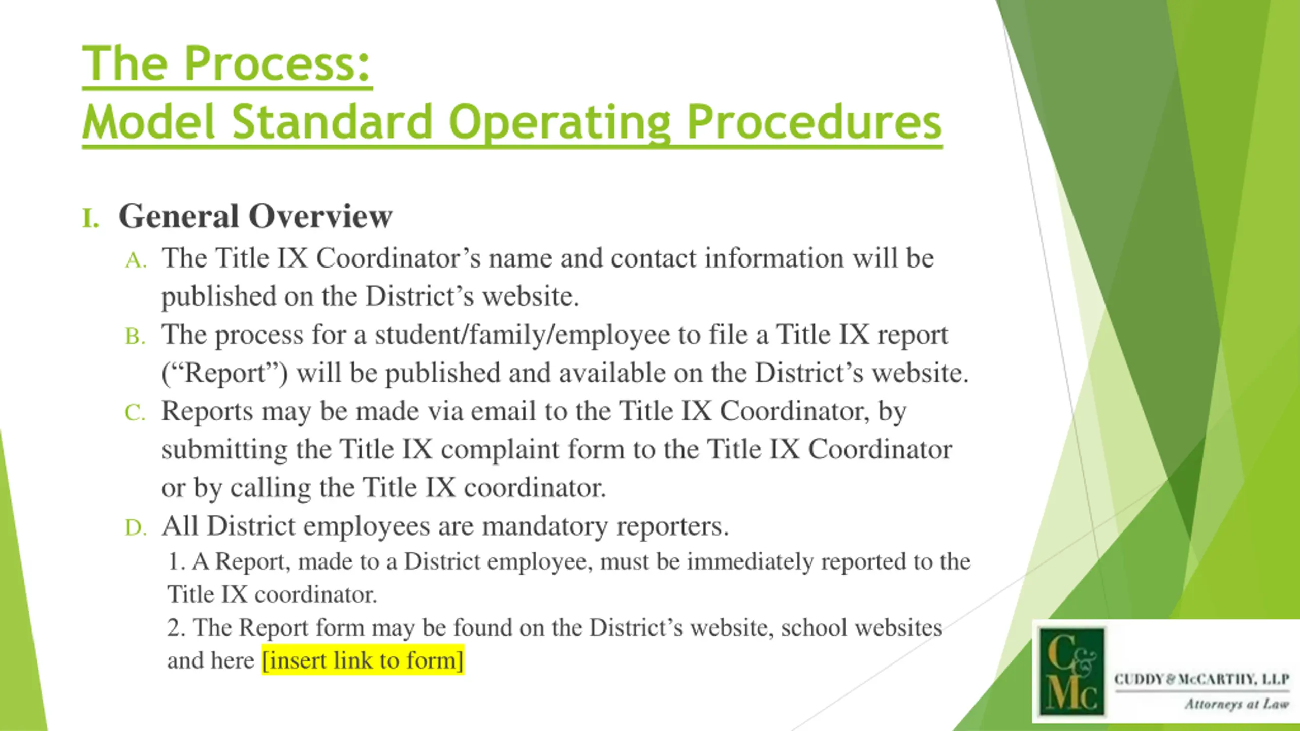 The Process: Model Standard Operating Procedures I. General Overview A. The Title IX Coordinator s name and contact information will be published on the District s website. B. The process for a student/family/employee to file a Title IX report ( Report ) will be published and available on the District s website. C. Reports may be made via email to the Title IX Coordinator, by submitting the Title IX complaint form to the Title IX Coordinator or by calling the Title IX coordinator. D. All District employees are mandatory reporters. 1. A Report, made to a District employee, must be immediately reported to the Title IX coordinator. 2. The Report form may be found on the District s website, school websites and here [insert link to form]