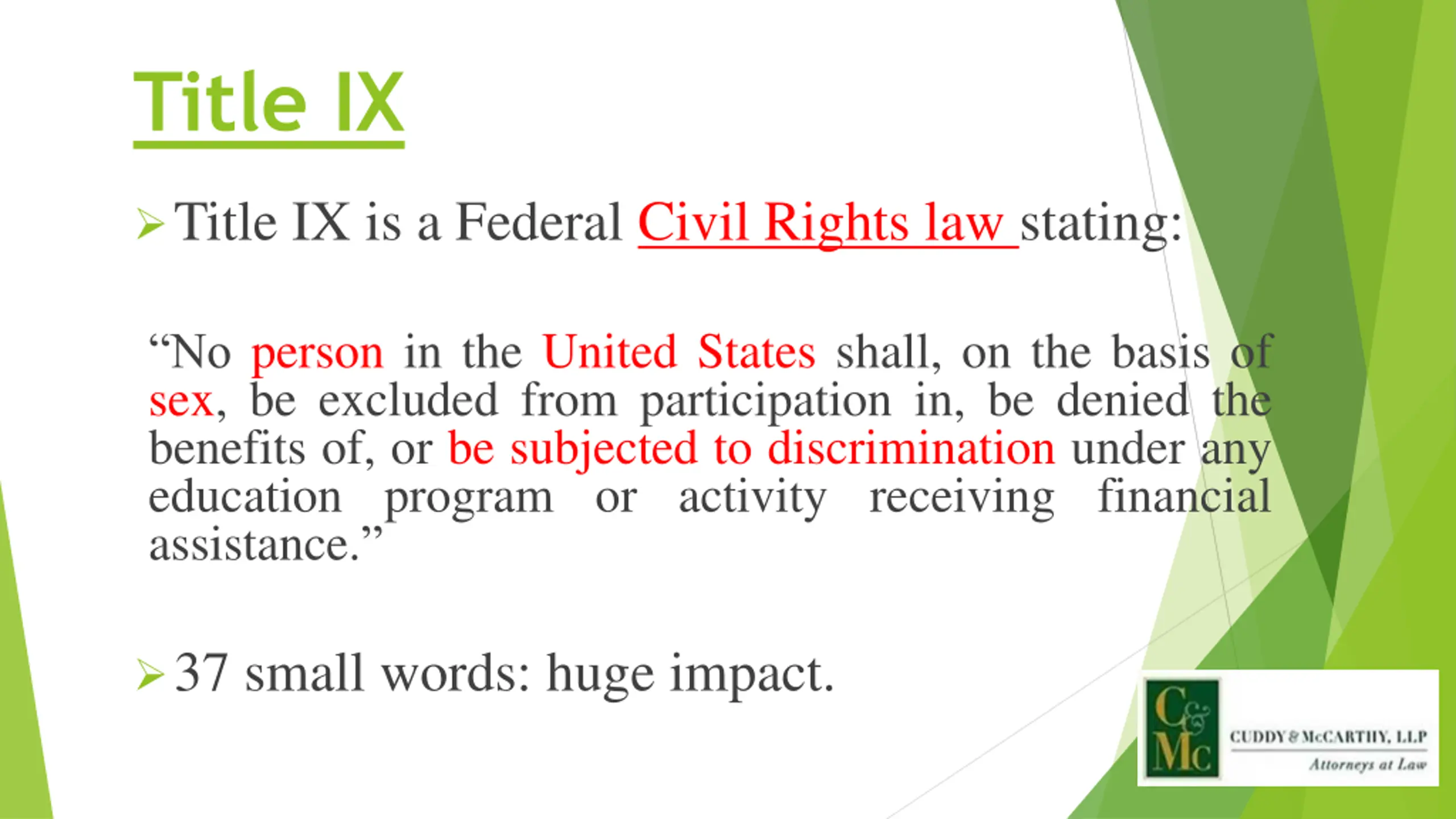 Title IX Title IX is a Federal Civil Rights law stating: No person in the United States shall, on the basis of sex, be excluded from participation in, be denied the benefits of, or be subjected to discrimination under any education program or activity receiving financial assistance. 37 small words: huge impact.