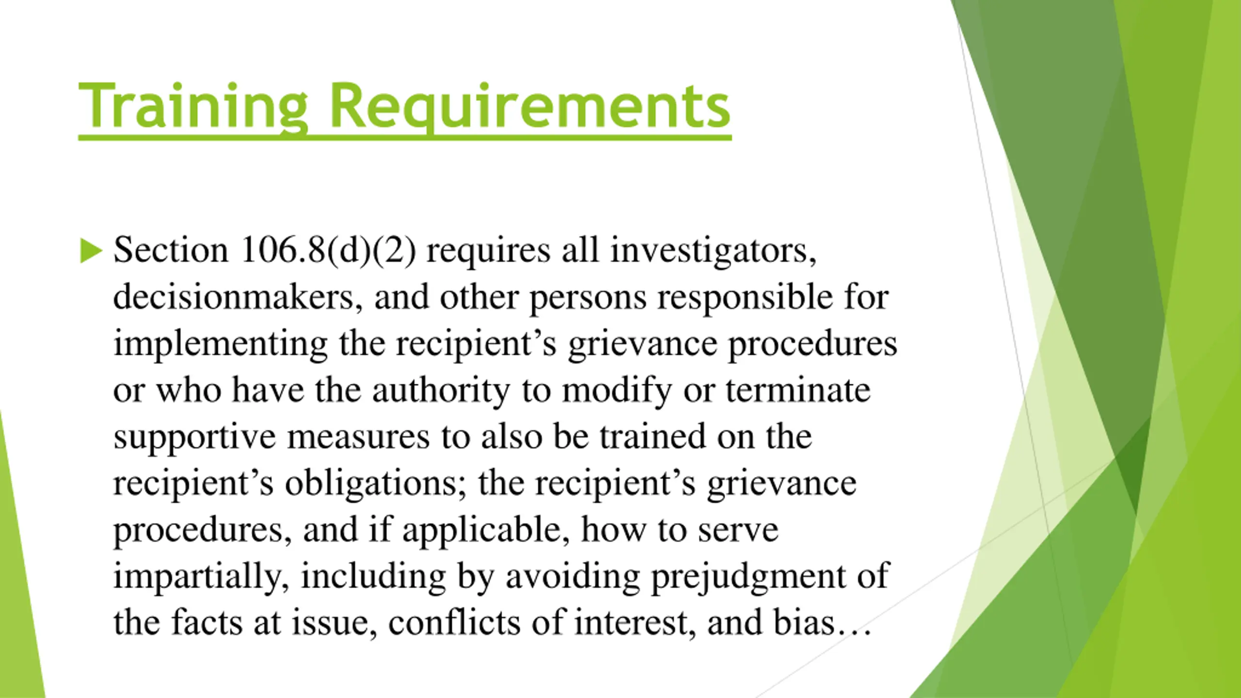 Training Requirements Section 106.8(d)(2) requires all investigators, decisionmakers, and other persons responsible for implementing the recipient s grievance procedures or who have the authority to modify or terminate supportive measures to also be trained on the recipient s obligations; the recipient s grievance procedures, and if applicable, how to serve impartially, including by avoiding prejudgment of the facts at issue, conflicts of interest, and bias