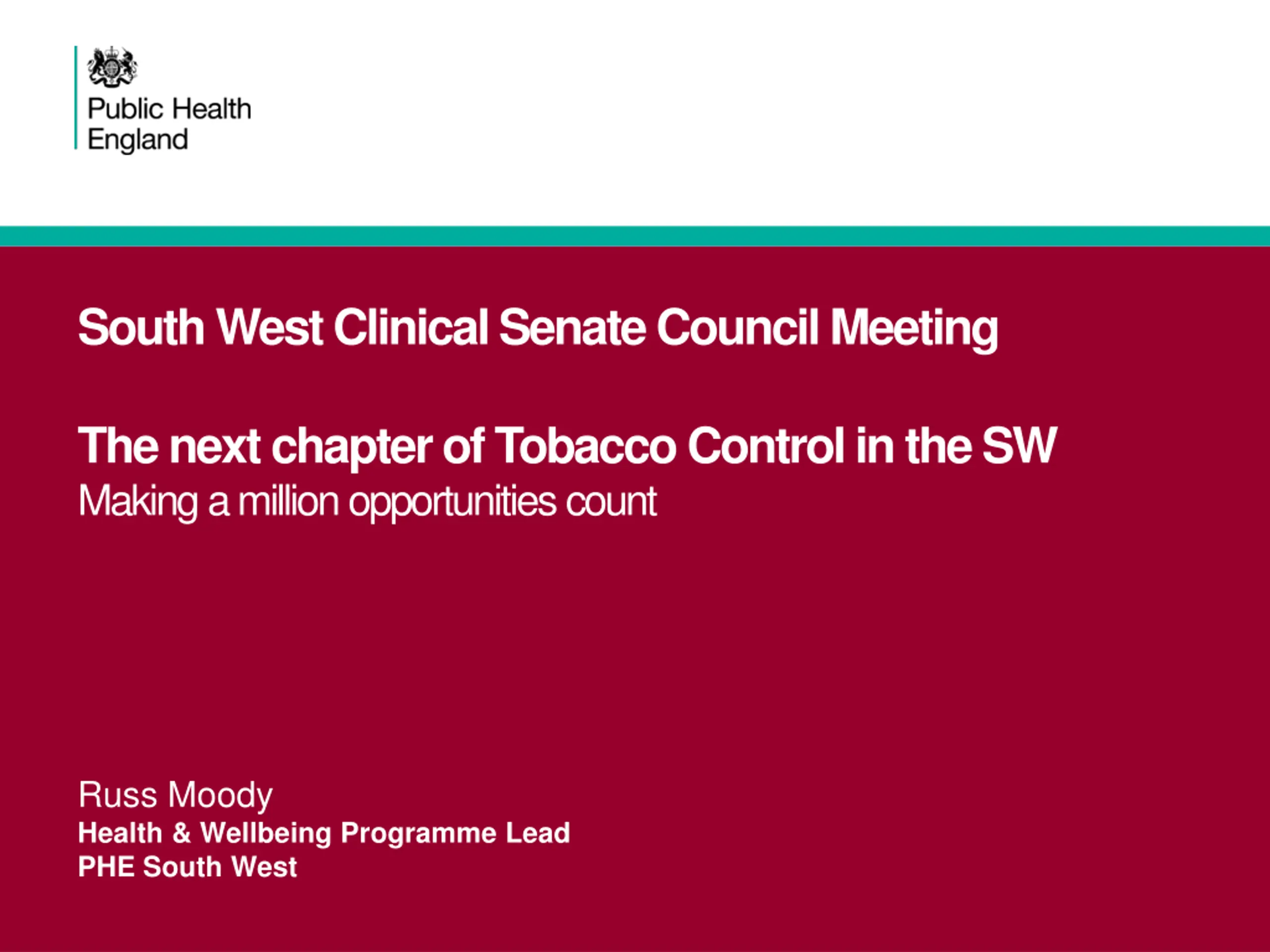South West Clinical Senate Council Meeting The next chapter of Tobacco Control in the SW Making a million opportunities count Russ Moody Health & Wellbeing Programme Lead PHE South West