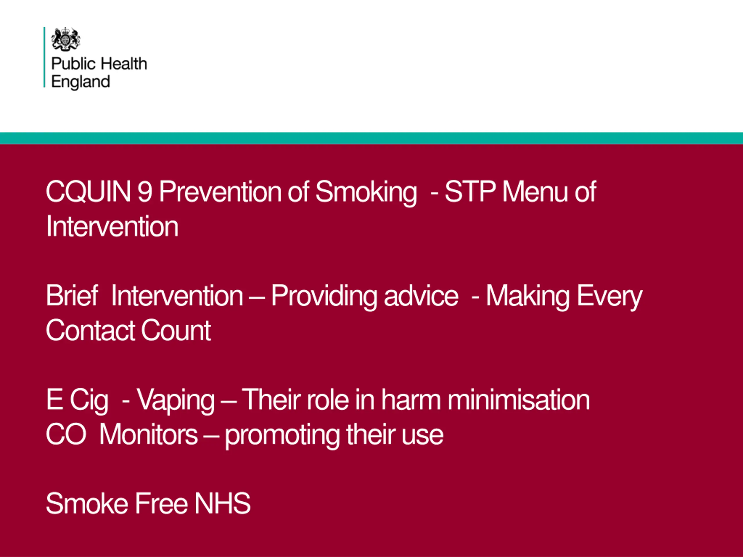 CQUIN 9 Prevention of Smoking - STP Menu of Intervention Brief Intervention Providing advice - Making Every Contact Count E Cig - Vaping Their role in harm minimisation CO Monitors promoting their use Smoke Free NHS
