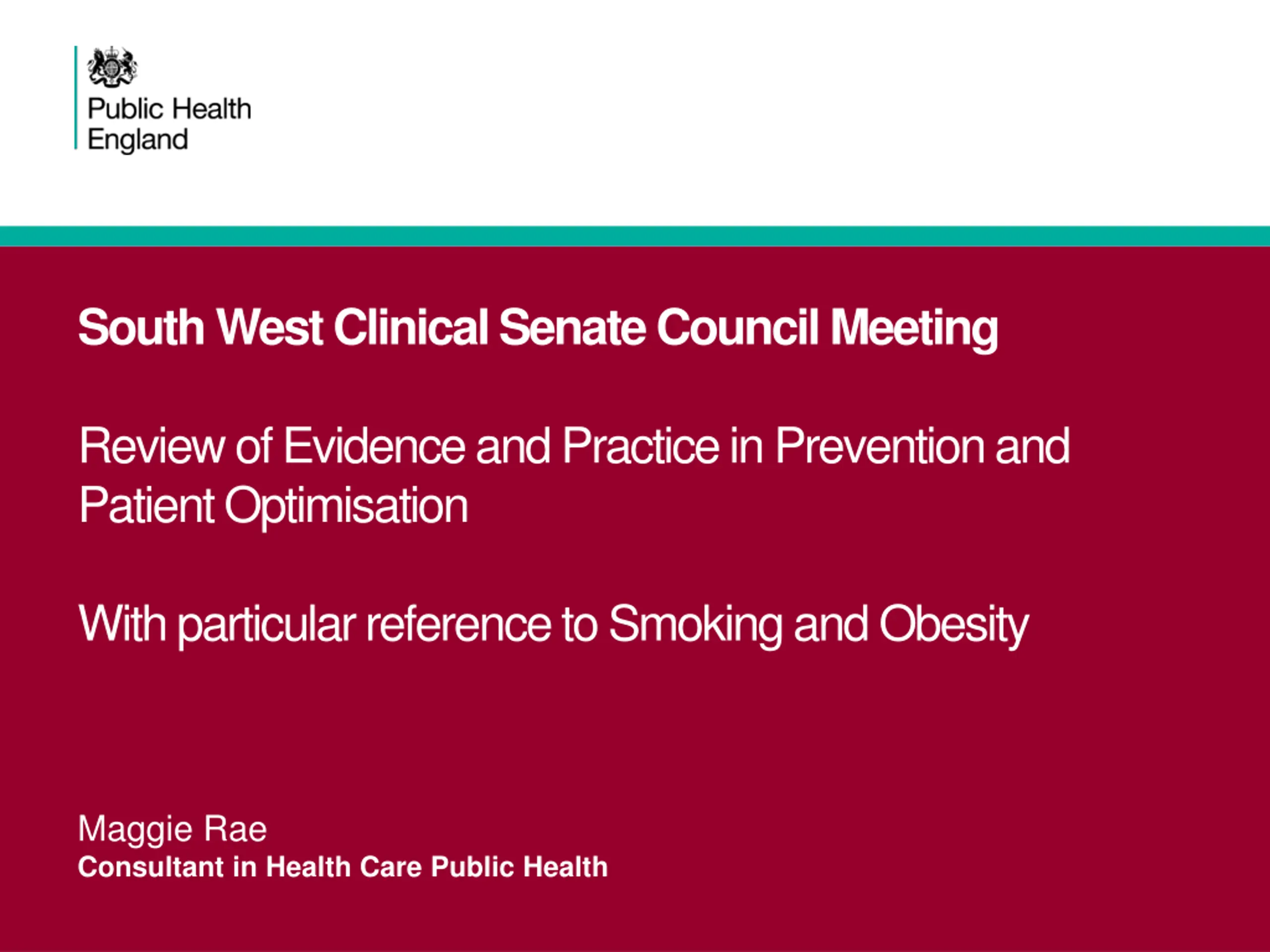 South West Clinical Senate Council Meeting Review of Evidence and Practice in Prevention and Patient Optimisation With particular reference to Smoking and Obesity Maggie Rae Consultant in Health Care Public Health