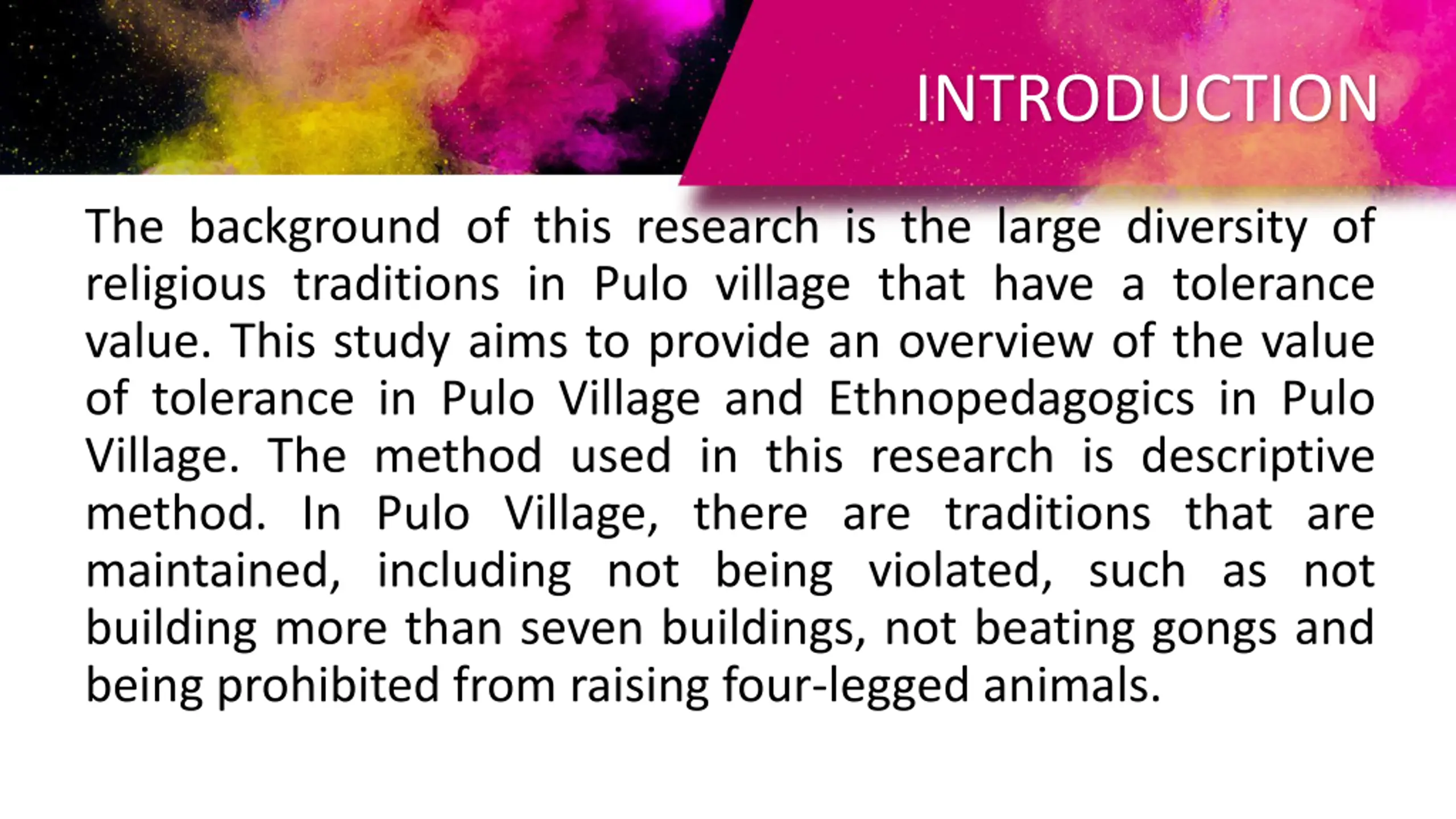 INTRODUCTION The background of this research is the large diversity of religious traditions in Pulo village that have a tolerance value. This study aims to provide an overview of the value of tolerance in Pulo Village and Ethnopedagogics in Pulo Village. The method used in this research is descriptive method. In Pulo Village, there are traditions that are maintained, including not being violated, such as not building more than seven buildings, not beating gongs and being prohibited from raising four-legged animals.
