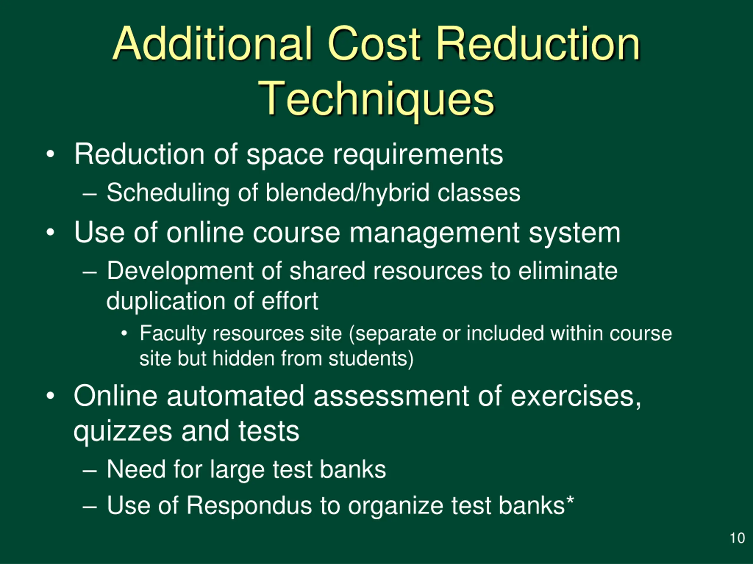 Additional Cost Reduction Techniques Reduction of space requirements Scheduling of blended/hybrid classes Use of online course management system Development of shared resources to eliminate duplication of effort Faculty resources site (separate or included within course site but hidden from students) Online automated assessment of exercises, quizzes and tests Need for large test banks Use of Respondus to organize test banks* 10