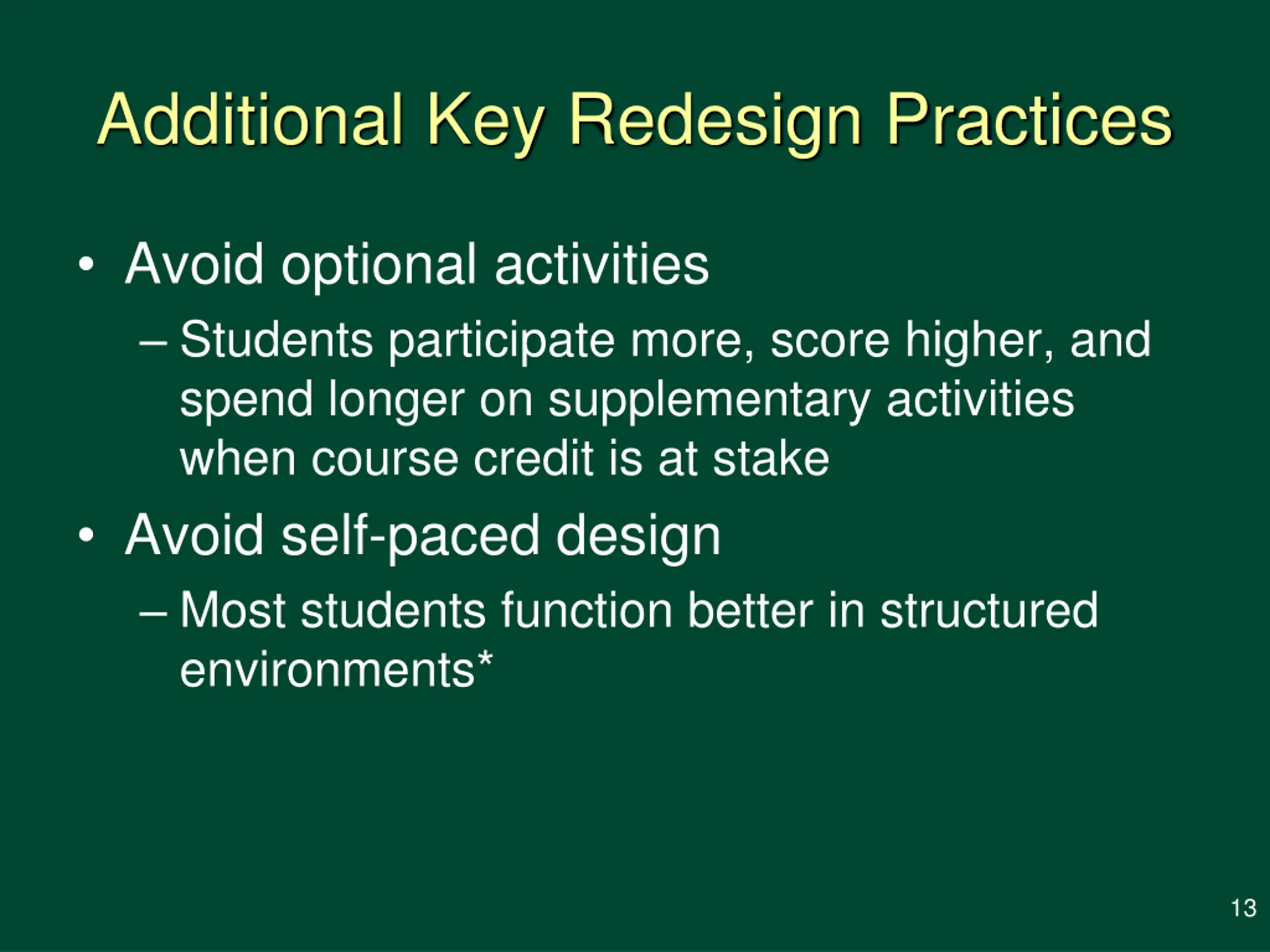 Additional Key Redesign Practices Avoid optional activities Students participate more, score higher, and spend longer on supplementary activities when course credit is at stake Avoid self-paced design Most students function better in structured environments* 13