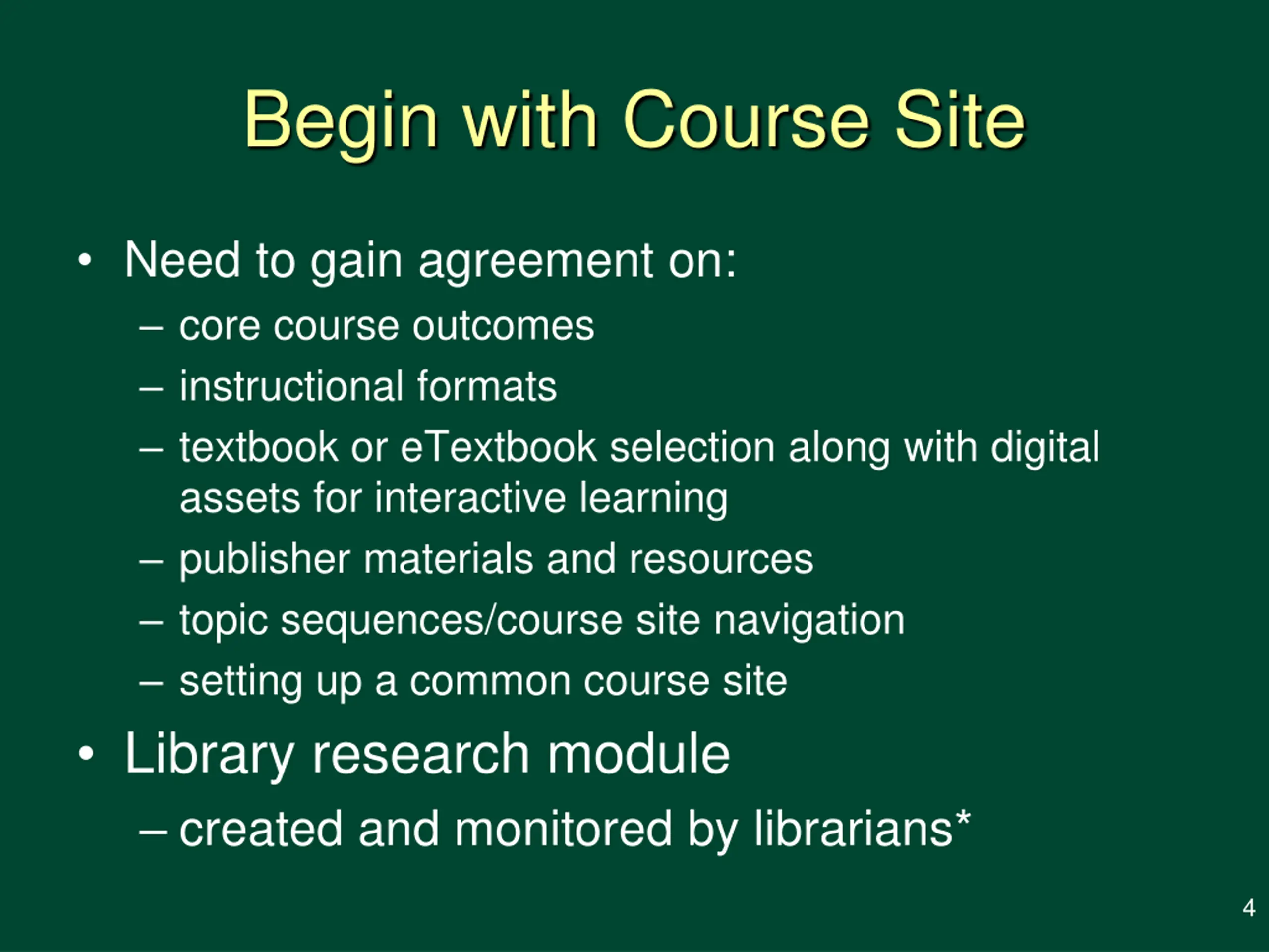 Begin with Course Site Need to gain agreement on: core course outcomes instructional formats textbook or eTextbook selection along with digital assets for interactive learning publisher materials and resources topic sequences/course site navigation setting up a common course site Library research module created and monitored by librarians* 4