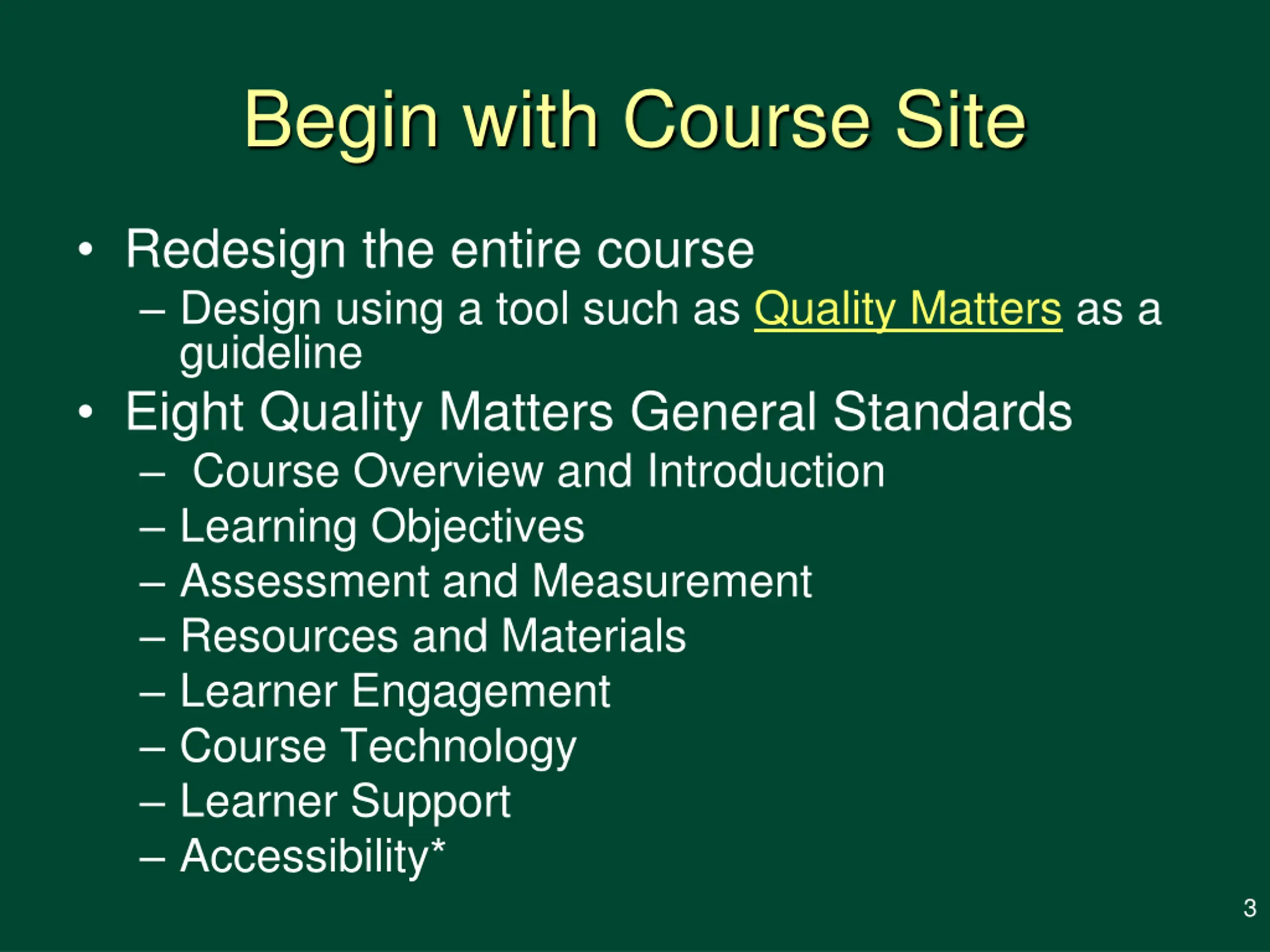 Begin with Course Site Redesign the entire course Design using a tool such as Quality Matters as a guideline Eight Quality Matters General Standards Course Overview and Introduction Learning Objectives Assessment and Measurement Resources and Materials Learner Engagement Course Technology Learner Support Accessibility* 3