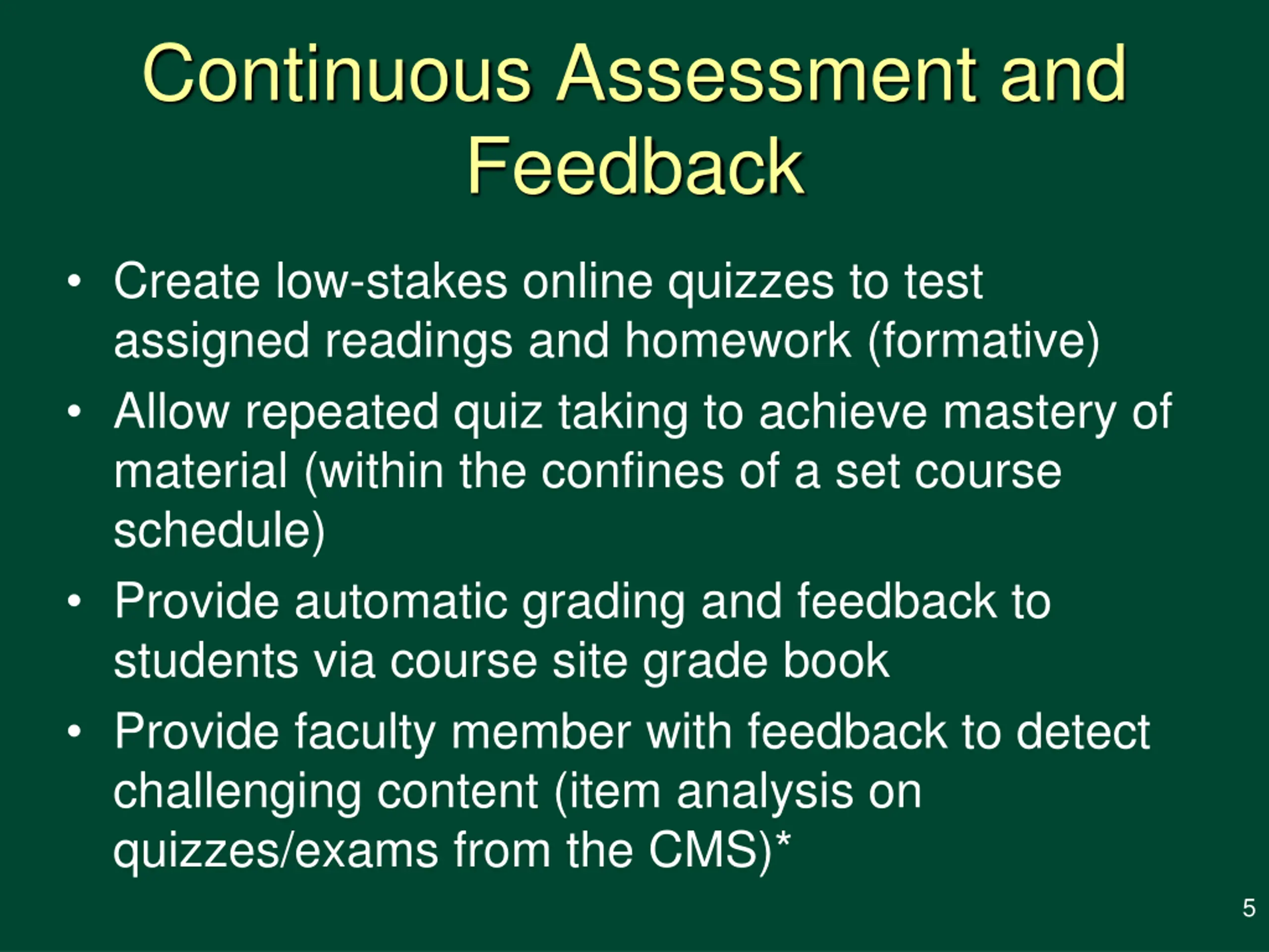 Continuous Assessment and Feedback Create low-stakes online quizzes to test assigned readings and homework (formative) Allow repeated quiz taking to achieve mastery of material (within the confines of a set course schedule) Provide automatic grading and feedback to students via course site grade book Provide faculty member with feedback to detect challenging content (item analysis on quizzes/exams from the CMS)* 5