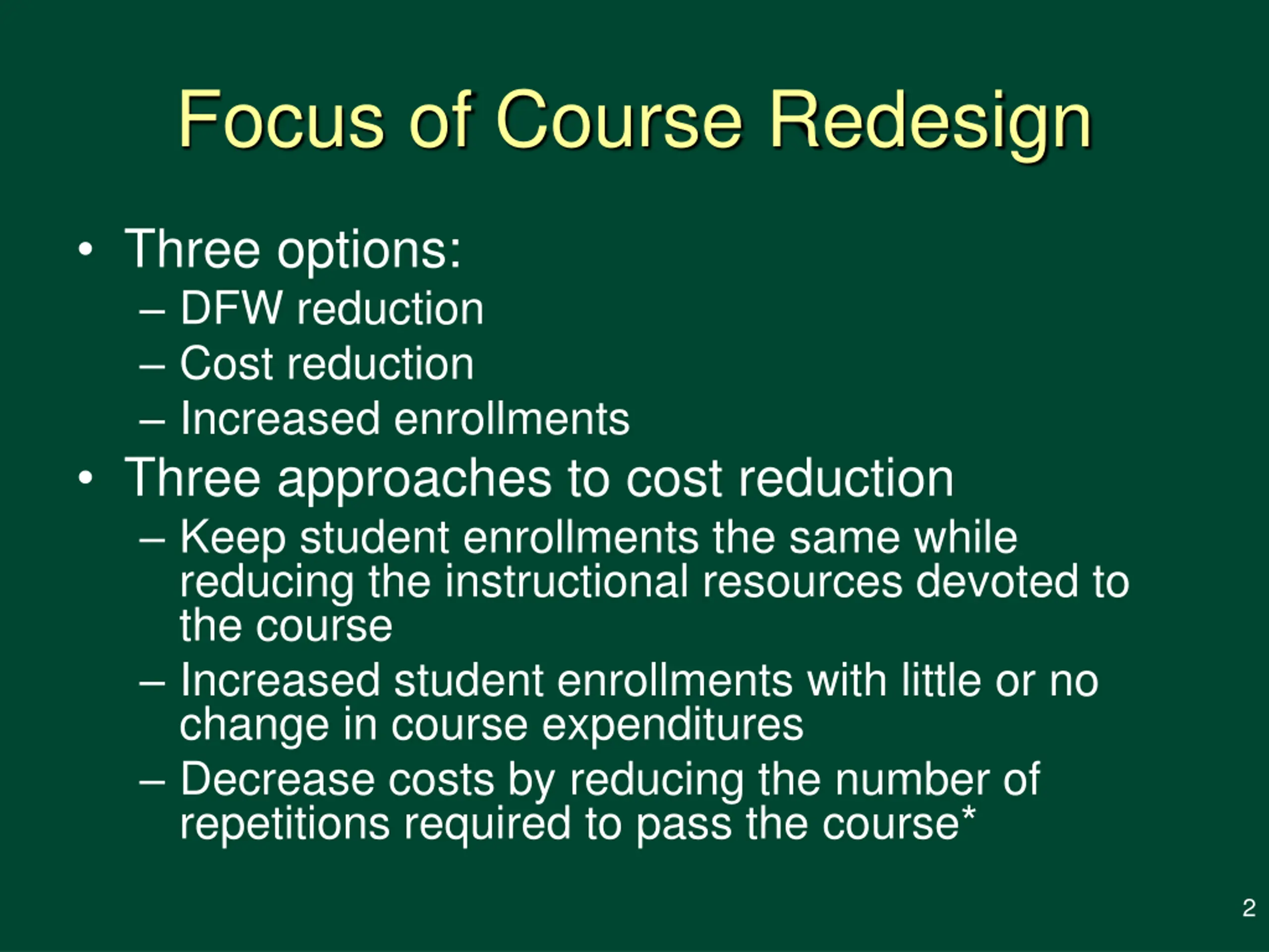 Focus of Course Redesign Three options: DFW reduction Cost reduction Increased enrollments Three approaches to cost reduction Keep student enrollments the same while reducing the instructional resources devoted to the course Increased student enrollments with little or no change in course expenditures Decrease costs by reducing the number of repetitions required to pass the course* 2