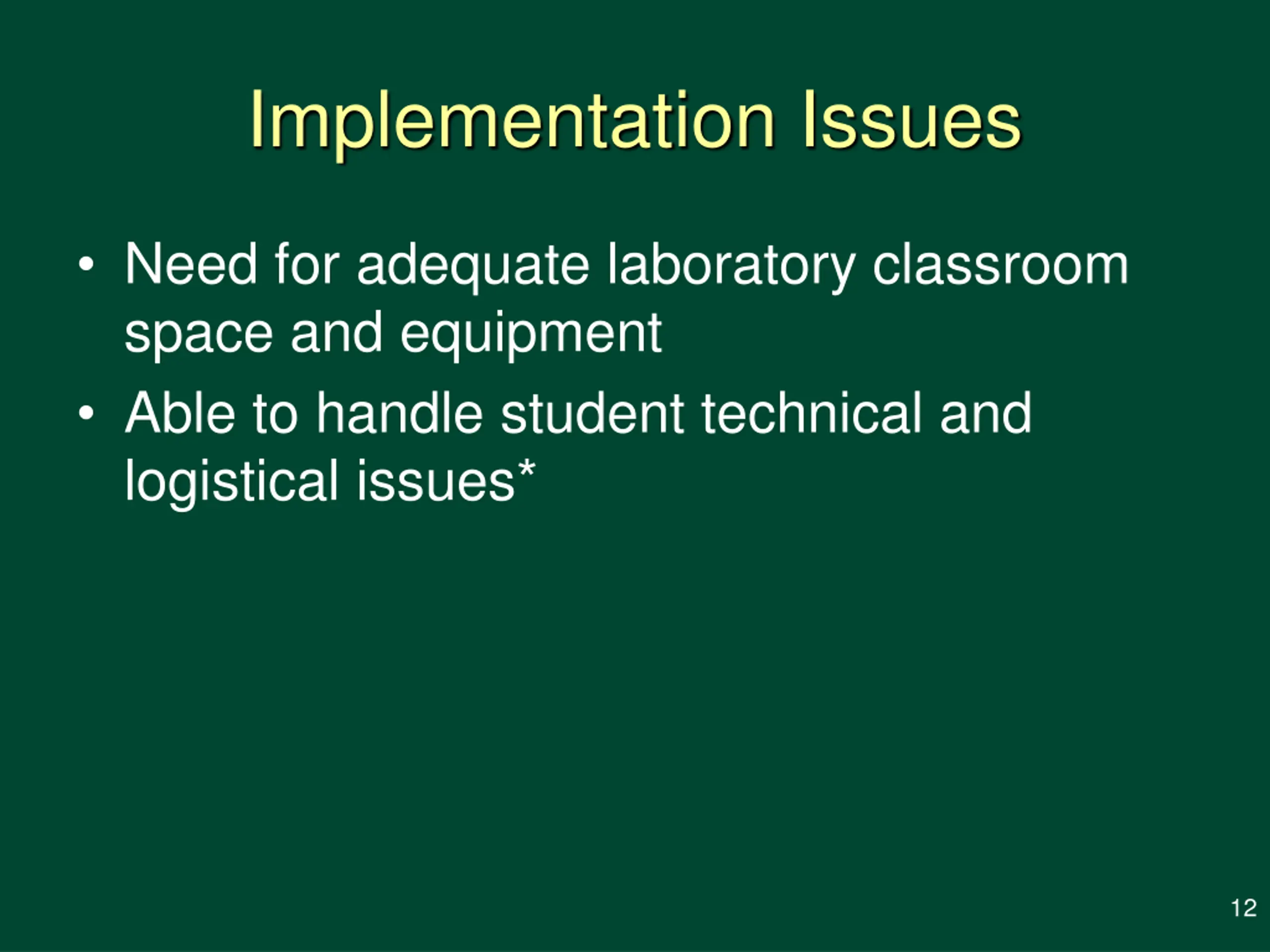 Implementation Issues Need for adequate laboratory classroom space and equipment Able to handle student technical and logistical issues* 12