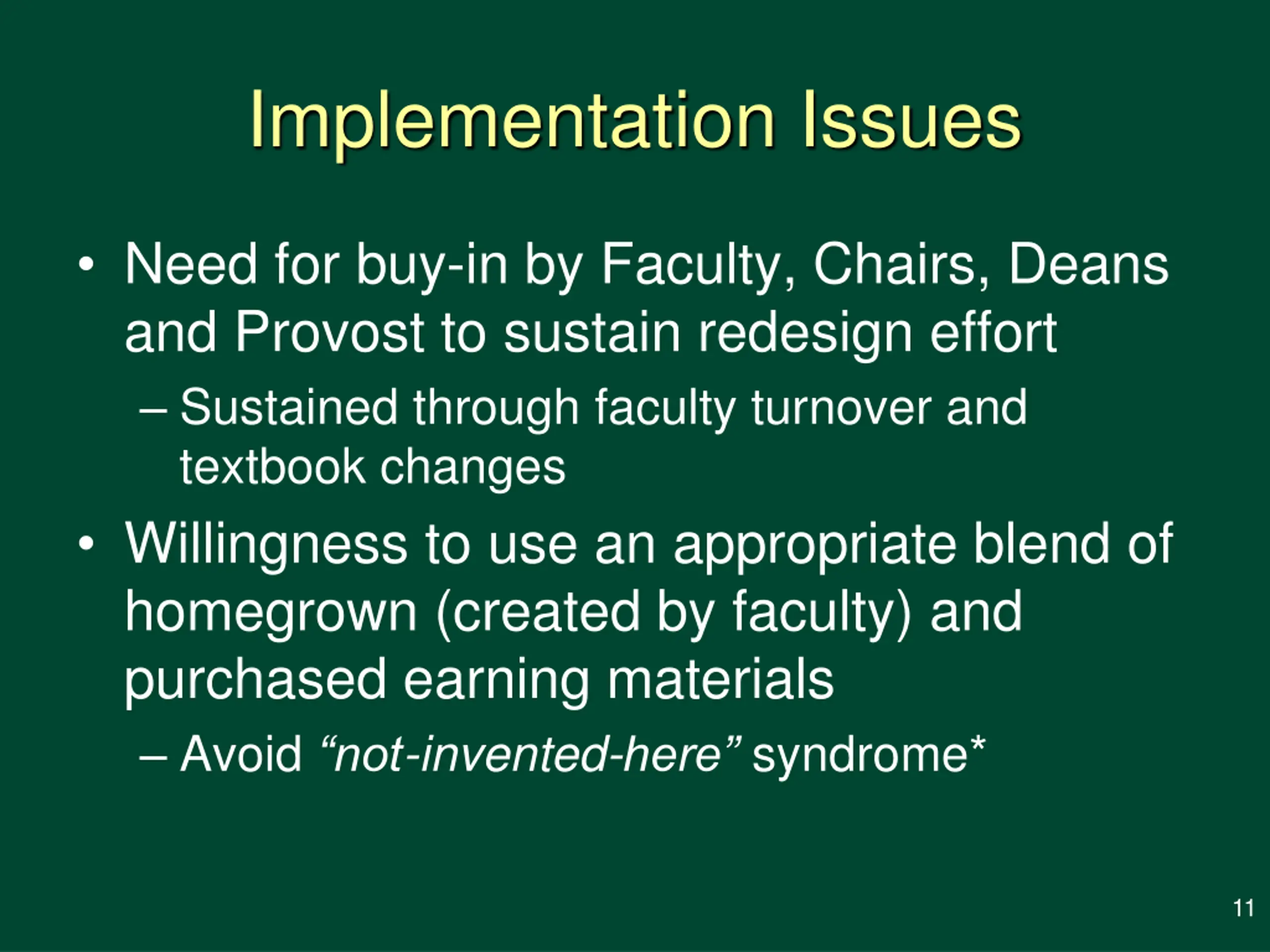 Implementation Issues Need for buy-in by Faculty, Chairs, Deans and Provost to sustain redesign effort Sustained through faculty turnover and textbook changes Willingness to use an appropriate blend of homegrown (created by faculty) and purchased earning materials Avoid not-invented-here syndrome* 11