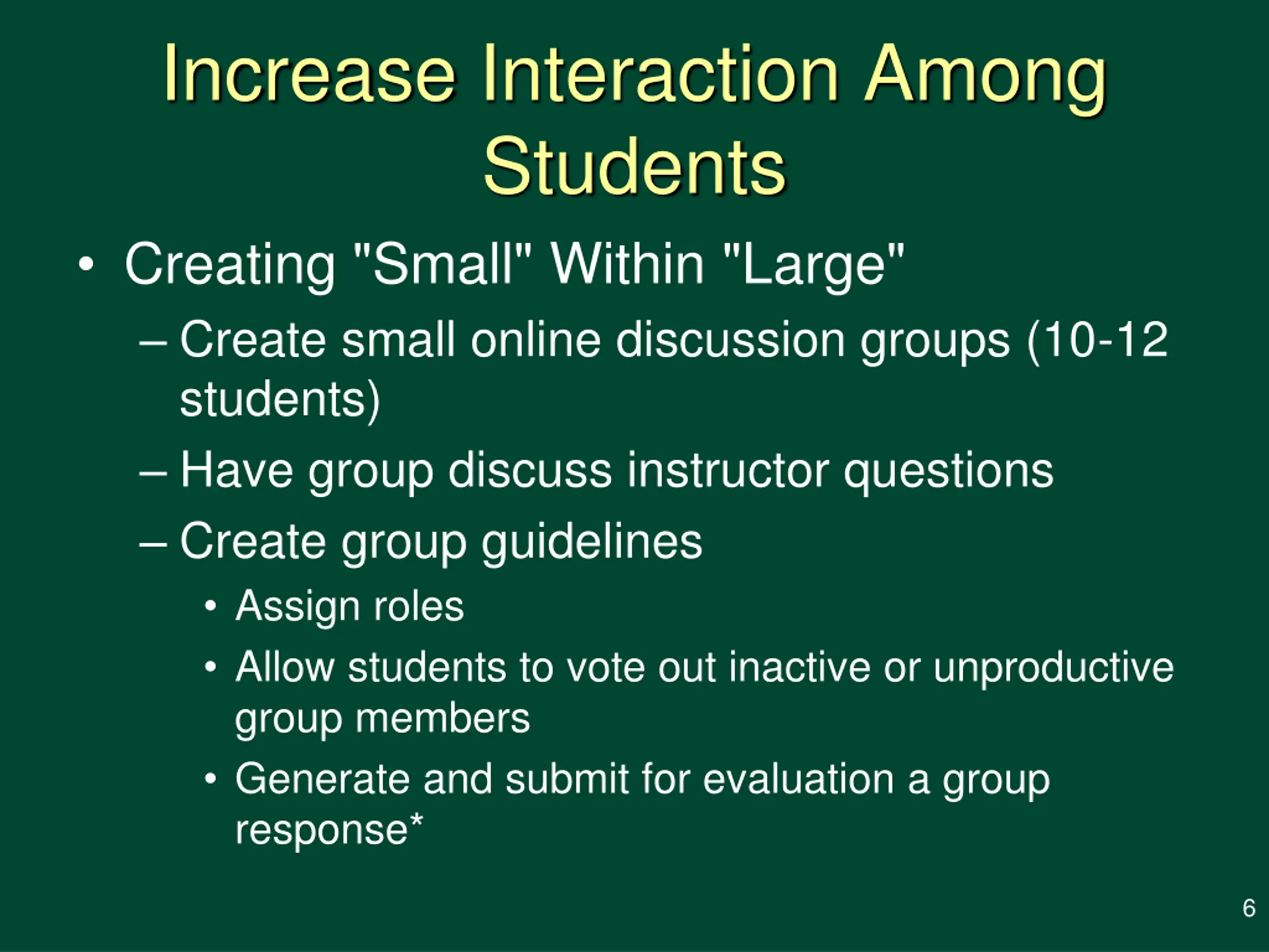 Increase Interaction Among Students Creating "Small" Within "Large" Create small online discussion groups (10-12 students) Have group discuss instructor questions Create group guidelines Assign roles Allow students to vote out inactive or unproductive group members Generate and submit for evaluation a group response* 6