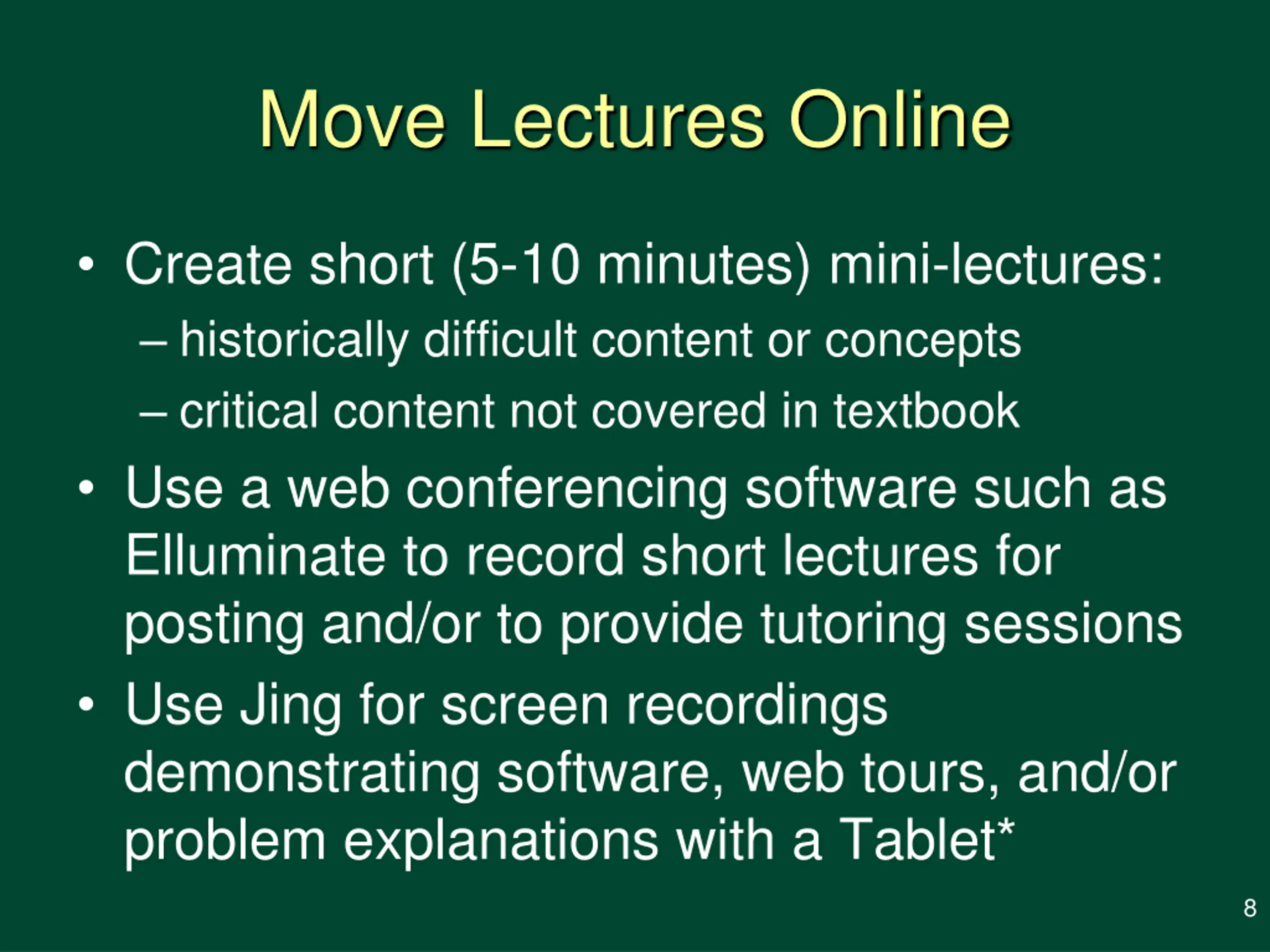 Move Lectures Online Create short (5-10 minutes) mini-lectures: historically difficult content or concepts critical content not covered in textbook Use a web conferencing software such as Elluminate to record short lectures for posting and/or to provide tutoring sessions Use Jing for screen recordings demonstrating software, web tours, and/or problem explanations with a Tablet* 8