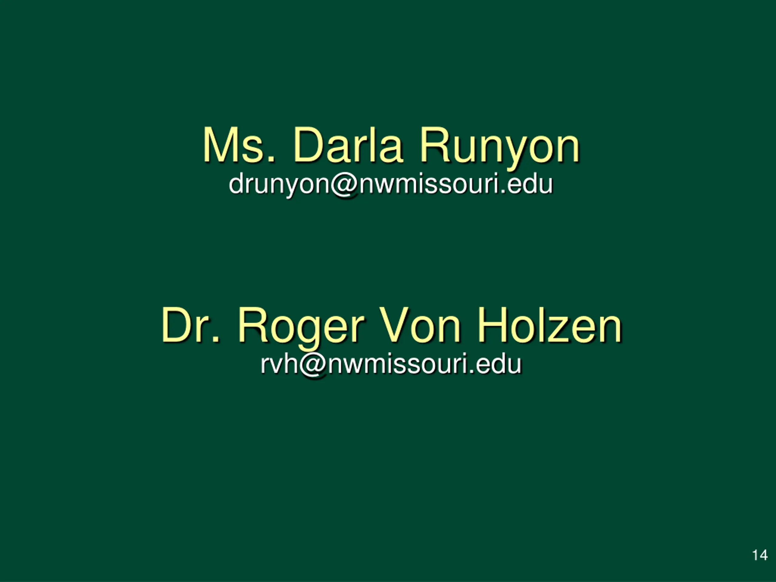 Ms. Darla Runyon drunyon@nwmissouri.edu Dr. Roger Von Holzen rvh@nwmissouri.edu 14