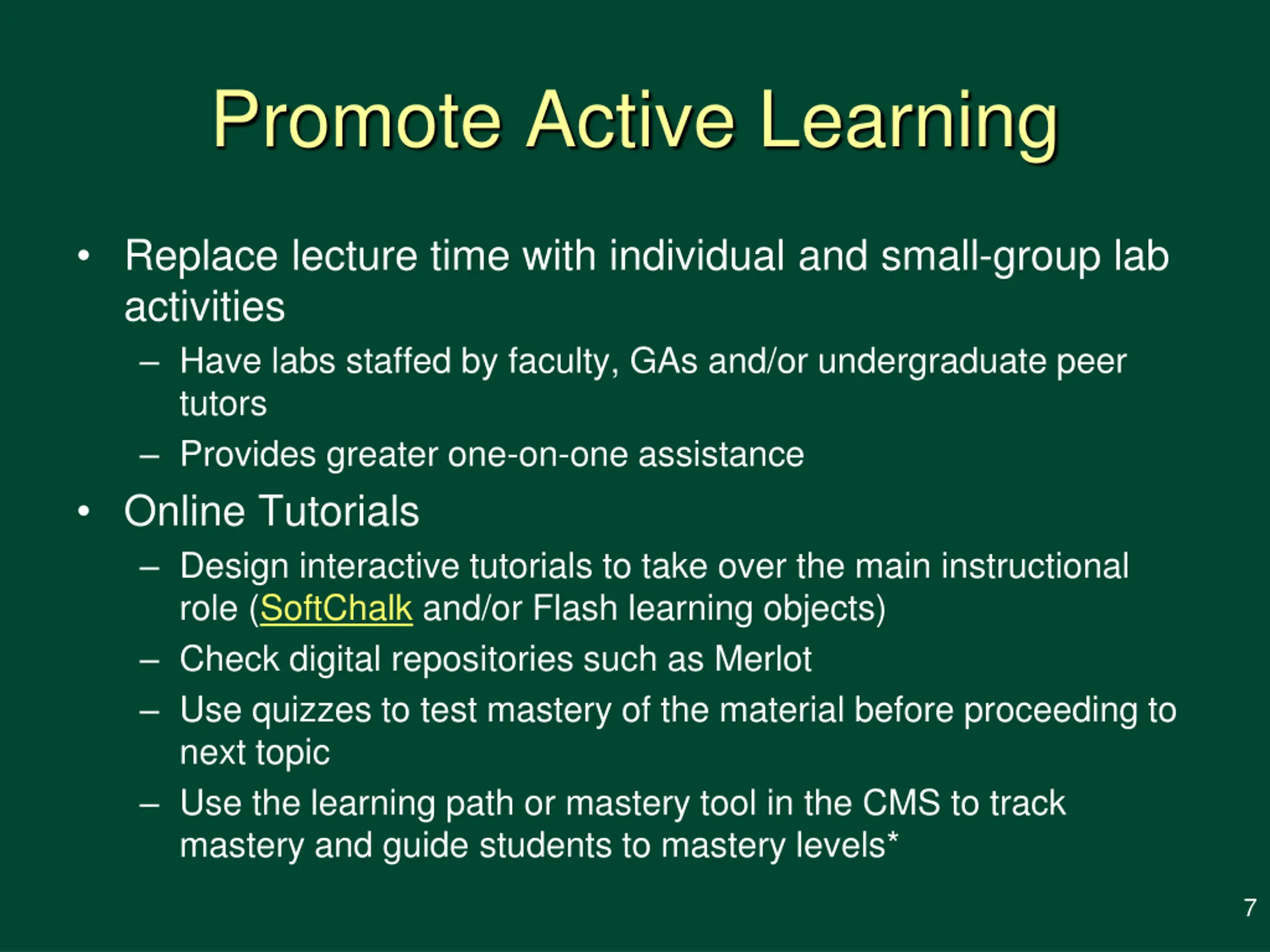 Promote Active Learning Replace lecture time with individual and small-group lab activities Have labs staffed by faculty, GAs and/or undergraduate peer tutors Provides greater one-on-one assistance Online Tutorials Design interactive tutorials to take over the main instructional role (SoftChalk and/or Flash learning objects) Check digital repositories such as Merlot Use quizzes to test mastery of the material before proceeding to next topic Use the learning path or mastery tool in the CMS to track mastery and guide students to mastery levels* 7
