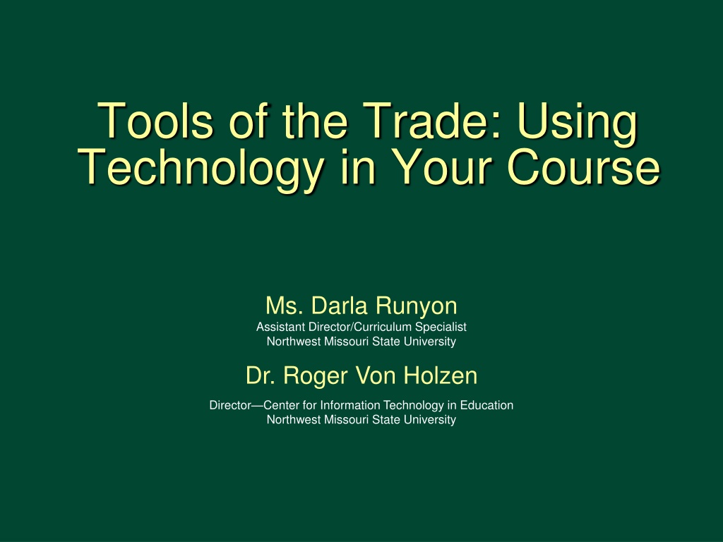 Tools of the Trade: Using Technology in Your Course Ms. Darla Runyon Assistant Director/Curriculum Specialist Northwest Missouri State University Dr. Roger Von Holzen Director Center for Information Technology in Education Northwest Missouri State University 1