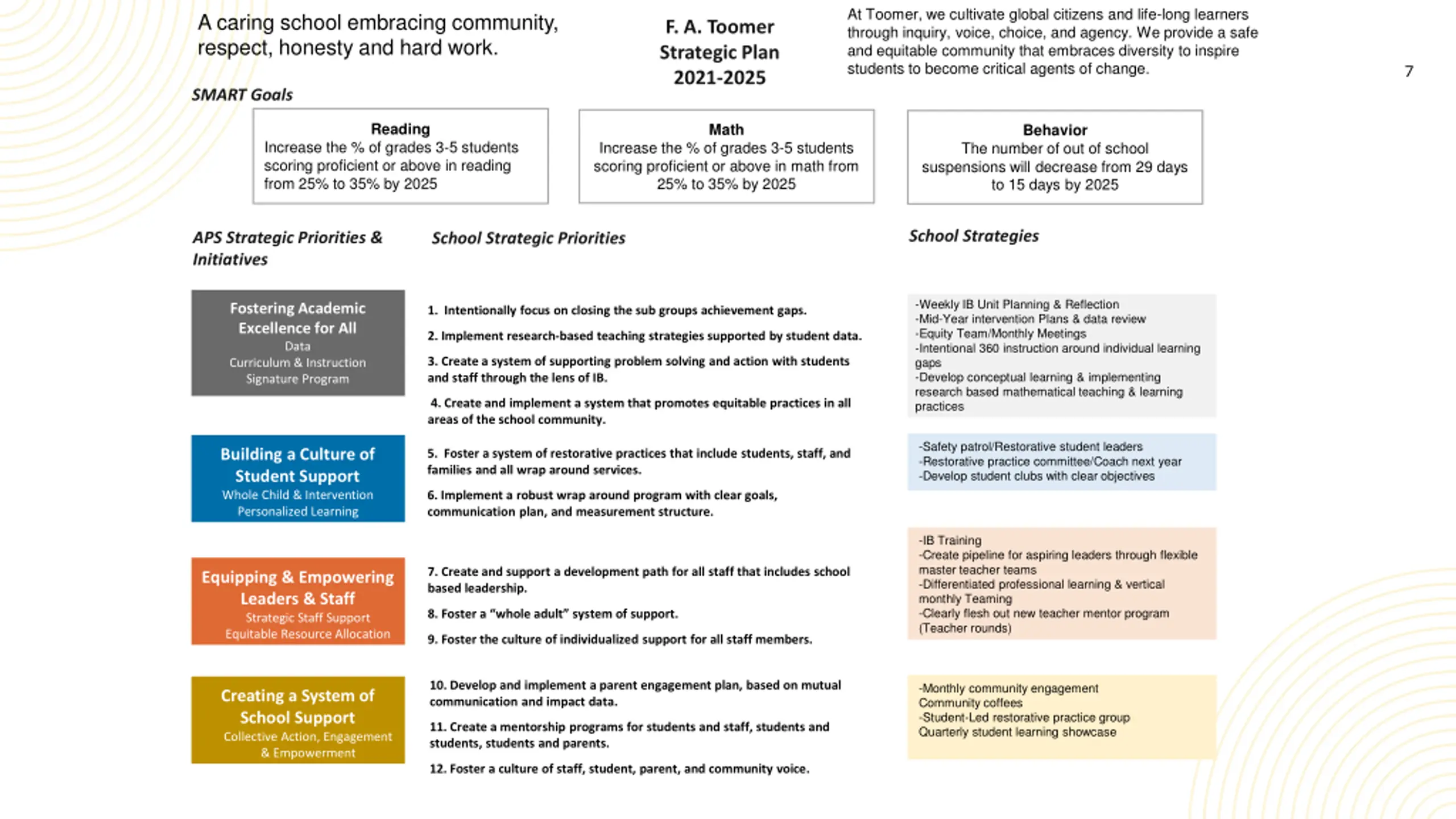 At Toomer, we cultivate global citizens and life-long learners through inquiry, voice, choice, and agency. We provide a safe and equitable community that embraces diversity to inspire students to become critical agents of change. A caring school embracing community, respect, honesty and hard work. F. A. Toomer Strategic Plan 2021-2025 7 SMART Goals Reading Math Behavior Increase the % of grades 3-5 students scoring proficient or above in reading from 25% to 35% by 2025 Increase the % of grades 3-5 students scoring proficient or above in math from 25% to 35% by 2025 The number of out of school suspensions will decrease from 29 days to 15 days by 2025 School Strategies APS Strategic Priorities & Initiatives School Strategic Priorities -Weekly IB Unit Planning & Reflection -Mid-Year intervention Plans & data review -Equity Team/Monthly Meetings -Intentional 360 instruction around individual learning gaps -Develop conceptual learning & implementing research based mathematical teaching & learning practices Fostering Academic Excellence for All Data Curriculum & Instruction Signature Program 1. Intentionally focus on closing the sub groups achievement gaps. 2. Implement research-based teaching strategies supported by student data. 3. Create a system of supporting problem solving and action with students and staff through the lens of IB. 4. Create and implement a system that promotes equitable practices in all areas of the school community. -Safety patrol/Restorative student leaders -Restorative practice committee/Coach next year -Develop student clubs with clear objectives Building a Culture of Student Support Whole Child & Intervention Personalized Learning 5. Foster a system of restorative practices that include students, staff, and families and all wrap around services. 6. Implement a robust wrap around program with clear goals, communication plan, and measurement structure. -IB Training -Create pipeline for aspiring leaders through flexible master teacher teams -Differentiated professional learning & vertical monthly Teaming -Clearly flesh out new teacher mentor program (Teacher rounds) 7. Create and support a development path for all staff that includes school based leadership. Equipping & Empowering Leaders & Staff Strategic Staff Support Equitable Resource Allocation 8. Foster a whole adult system of support. 9. Foster the culture of individualized support for all staff members. 10. Develop and implement a parent engagement plan, based on mutual communication and impact data. -Monthly community engagement Community coffees -Student-Led restorative practice group Quarterly student learning showcase Creating a System of School Support Collective Action, Engagement & Empowerment 11. Create a mentorship programs for students and staff, students and students, students and parents. 12. Foster a culture of staff, student, parent, and community voice.