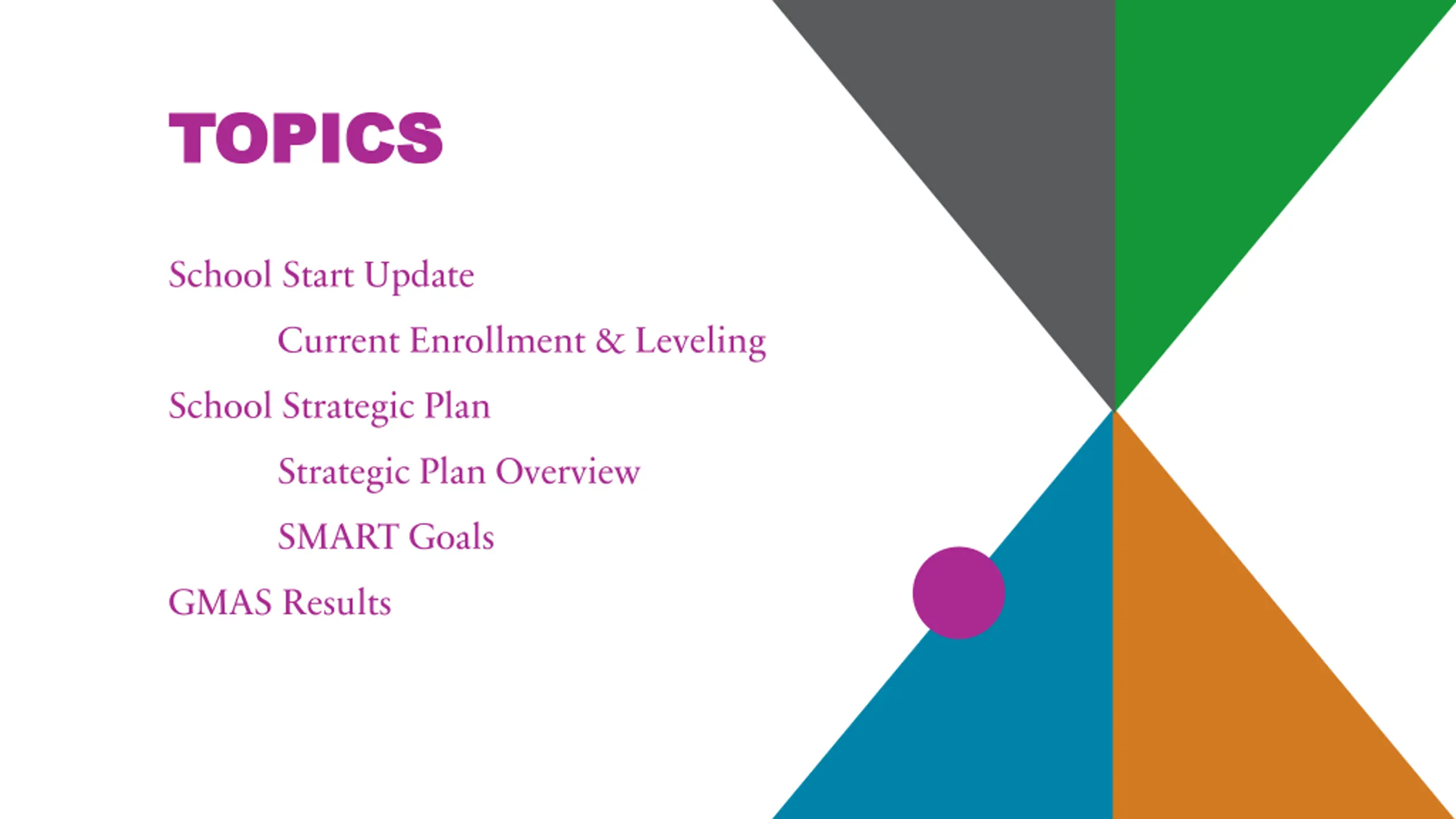 TOPICS TOPICS School Start Update Current Enrollment & Leveling School Strategic Plan Strategic Plan Overview SMART Goals GMAS Results