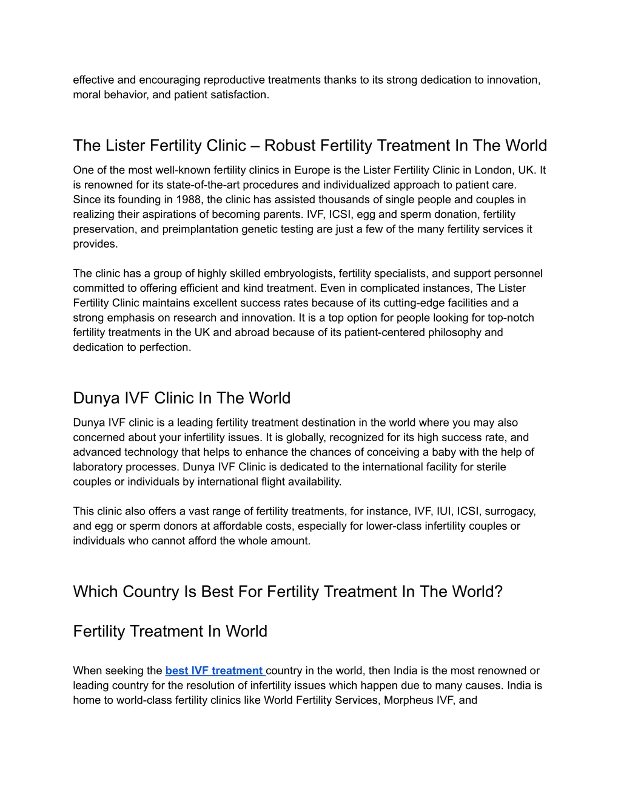 effective and encouraging reproductive treatments thanks to its strong dedication to innovation, moral behavior, and patient satisfaction. The Lister Fertility Clinic Robust Fertility Treatment In The World One of the most well-known fertility clinics in Europe is the Lister Fertility Clinic in London, UK. It is renowned for its state-of-the-art procedures and individualized approach to patient care. Since its founding in 1988, the clinic has assisted thousands of single people and couples in realizing their aspirations of becoming parents. IVF, ICSI, egg and sperm donation, fertility preservation, and preimplantation genetic testing are just a few of the many fertility services it provides. The clinic has a group of highly skilled embryologists, fertility specialists, and support personnel committed to offering efficient and kind treatment. Even in complicated instances, The Lister Fertility Clinic maintains excellent success rates because of its cutting-edge facilities and a strong emphasis on research and innovation. It is a top option for people looking for top-notch fertility treatments in the UK and abroad because of its patient-centered philosophy and dedication to perfection. Dunya IVF Clinic In The World Dunya IVF clinic is a leading fertility treatment destination in the world where you may also concerned about your infertility issues. It is globally, recognized for its high success rate, and advanced technology that helps to enhance the chances of conceiving a baby with the help of laboratory processes. Dunya IVF Clinic is dedicated to the international facility for sterile couples or individuals by international flight availability. This clinic also offers a vast range of fertility treatments, for instance, IVF, IUI, ICSI, surrogacy, and egg or sperm donors at affordable costs, especially for lower-class infertility couples or individuals who cannot afford the whole amount. Which Country Is Best For Fertility Treatment In The World? Fertility Treatment In World When seeking the best IVF treatment country in the world, then India is the most renowned or leading country for the resolution of infertility issues which happen due to many causes. India is home to world-class fertility clinics like World Fertility Services, Morpheus IVF, and