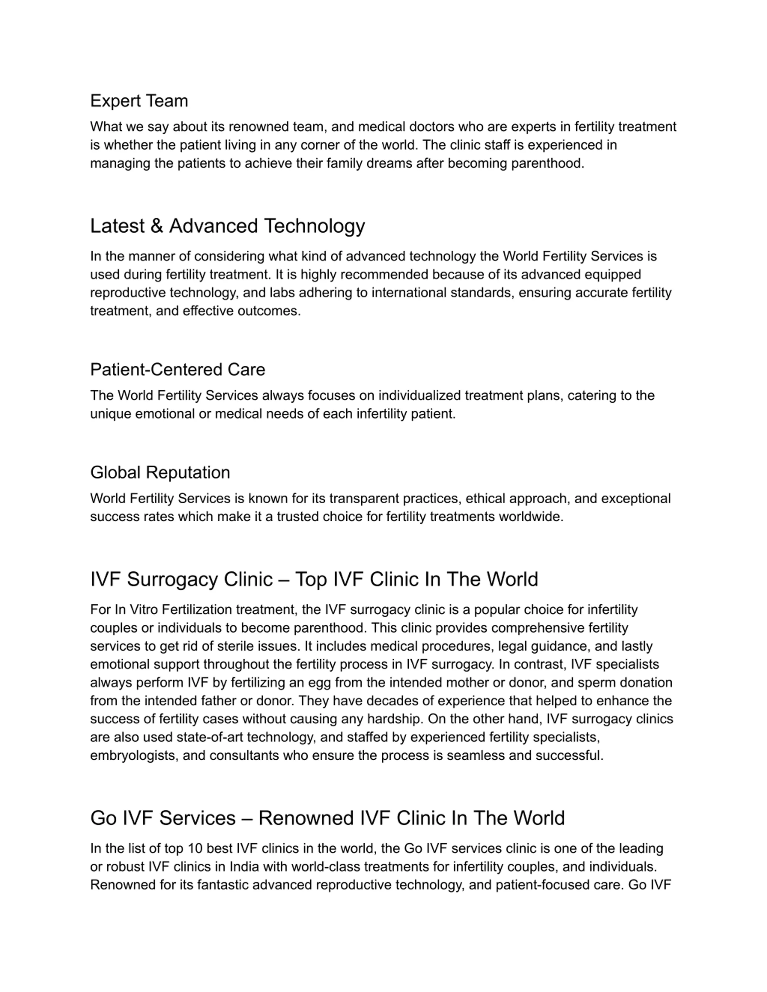 Expert Team What we say about its renowned team, and medical doctors who are experts in fertility treatment is whether the patient living in any corner of the world. The clinic staff is experienced in managing the patients to achieve their family dreams after becoming parenthood. Latest & Advanced Technology In the manner of considering what kind of advanced technology the World Fertility Services is used during fertility treatment. It is highly recommended because of its advanced equipped reproductive technology, and labs adhering to international standards, ensuring accurate fertility treatment, and effective outcomes. Patient-Centered Care The World Fertility Services always focuses on individualized treatment plans, catering to the unique emotional or medical needs of each infertility patient. Global Reputation World Fertility Services is known for its transparent practices, ethical approach, and exceptional success rates which make it a trusted choice for fertility treatments worldwide. IVF Surrogacy Clinic Top IVF Clinic In The World For In Vitro Fertilization treatment, the IVF surrogacy clinic is a popular choice for infertility couples or individuals to become parenthood. This clinic provides comprehensive fertility services to get rid of sterile issues. It includes medical procedures, legal guidance, and lastly emotional support throughout the fertility process in IVF surrogacy. In contrast, IVF specialists always perform IVF by fertilizing an egg from the intended mother or donor, and sperm donation from the intended father or donor. They have decades of experience that helped to enhance the success of fertility cases without causing any hardship. On the other hand, IVF surrogacy clinics are also used state-of-art technology, and staffed by experienced fertility specialists, embryologists, and consultants who ensure the process is seamless and successful. Go IVF Services Renowned IVF Clinic In The World In the list of top 10 best IVF clinics in the world, the Go IVF services clinic is one of the leading or robust IVF clinics in India with world-class treatments for infertility couples, and individuals. Renowned for its fantastic advanced reproductive technology, and patient-focused care. Go IVF