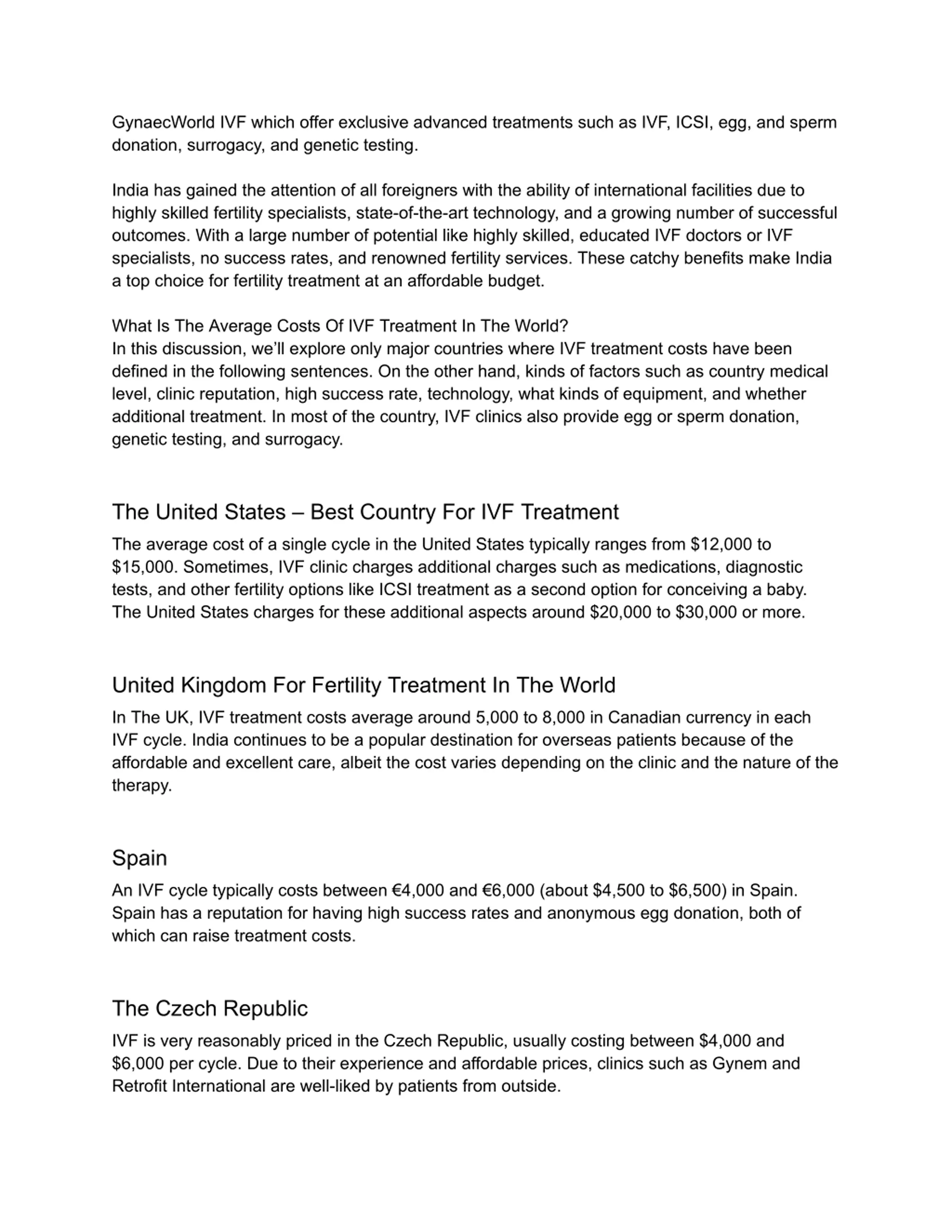 GynaecWorld IVF which offer exclusive advanced treatments such as IVF, ICSI, egg, and sperm donation, surrogacy, and genetic testing. India has gained the attention of all foreigners with the ability of international facilities due to highly skilled fertility specialists, state-of-the-art technology, and a growing number of successful outcomes. With a large number of potential like highly skilled, educated IVF doctors or IVF specialists, no success rates, and renowned fertility services. These catchy benefits make India a top choice for fertility treatment at an affordable budget. What Is The Average Costs Of IVF Treatment In The World? In this discussion, we ll explore only major countries where IVF treatment costs have been defined in the following sentences. On the other hand, kinds of factors such as country medical level, clinic reputation, high success rate, technology, what kinds of equipment, and whether additional treatment. In most of the country, IVF clinics also provide egg or sperm donation, genetic testing, and surrogacy. The United States Best Country For IVF Treatment The average cost of a single cycle in the United States typically ranges from $12,000 to $15,000. Sometimes, IVF clinic charges additional charges such as medications, diagnostic tests, and other fertility options like ICSI treatment as a second option for conceiving a baby. The United States charges for these additional aspects around $20,000 to $30,000 or more. United Kingdom For Fertility Treatment In The World In The UK, IVF treatment costs average around 5,000 to 8,000 in Canadian currency in each IVF cycle. India continues to be a popular destination for overseas patients because of the affordable and excellent care, albeit the cost varies depending on the clinic and the nature of the therapy. Spain An IVF cycle typically costs between 4,000 and 6,000 (about $4,500 to $6,500) in Spain. Spain has a reputation for having high success rates and anonymous egg donation, both of which can raise treatment costs. The Czech Republic IVF is very reasonably priced in the Czech Republic, usually costing between $4,000 and $6,000 per cycle. Due to their experience and affordable prices, clinics such as Gynem and Retrofit International are well-liked by patients from outside.