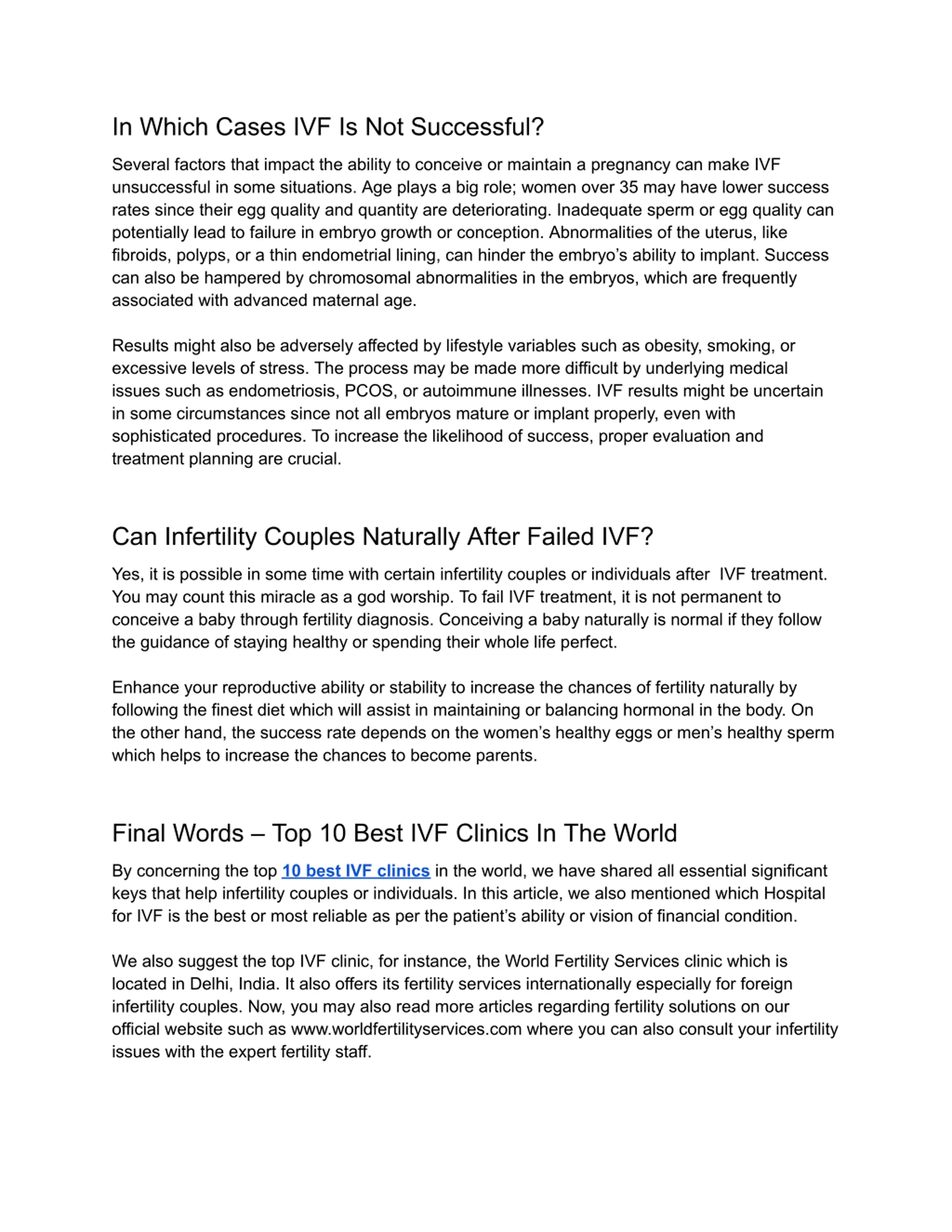In Which Cases IVF Is Not Successful? Several factors that impact the ability to conceive or maintain a pregnancy can make IVF unsuccessful in some situations. Age plays a big role; women over 35 may have lower success rates since their egg quality and quantity are deteriorating. Inadequate sperm or egg quality can potentially lead to failure in embryo growth or conception. Abnormalities of the uterus, like fibroids, polyps, or a thin endometrial lining, can hinder the embryo s ability to implant. Success can also be hampered by chromosomal abnormalities in the embryos, which are frequently associated with advanced maternal age. Results might also be adversely affected by lifestyle variables such as obesity, smoking, or excessive levels of stress. The process may be made more difficult by underlying medical issues such as endometriosis, PCOS, or autoimmune illnesses. IVF results might be uncertain in some circumstances since not all embryos mature or implant properly, even with sophisticated procedures. To increase the likelihood of success, proper evaluation and treatment planning are crucial. Can Infertility Couples Naturally After Failed IVF? Yes, it is possible in some time with certain infertility couples or individuals after IVF treatment. You may count this miracle as a god worship. To fail IVF treatment, it is not permanent to conceive a baby through fertility diagnosis. Conceiving a baby naturally is normal if they follow the guidance of staying healthy or spending their whole life perfect. Enhance your reproductive ability or stability to increase the chances of fertility naturally by following the finest diet which will assist in maintaining or balancing hormonal in the body. On the other hand, the success rate depends on the women s healthy eggs or men s healthy sperm which helps to increase the chances to become parents. Final Words Top 10 Best IVF Clinics In The World By concerning the top 10 best IVF clinics in the world, we have shared all essential significant keys that help infertility couples or individuals. In this article, we also mentioned which Hospital for IVF is the best or most reliable as per the patient s ability or vision of financial condition. We also suggest the top IVF clinic, for instance, the World Fertility Services clinic which is located in Delhi, India. It also offers its fertility services internationally especially for foreign infertility couples. Now, you may also read more articles regarding fertility solutions on our official website such as www.worldfertilityservices.com where you can also consult your infertility issues with the expert fertility staff.