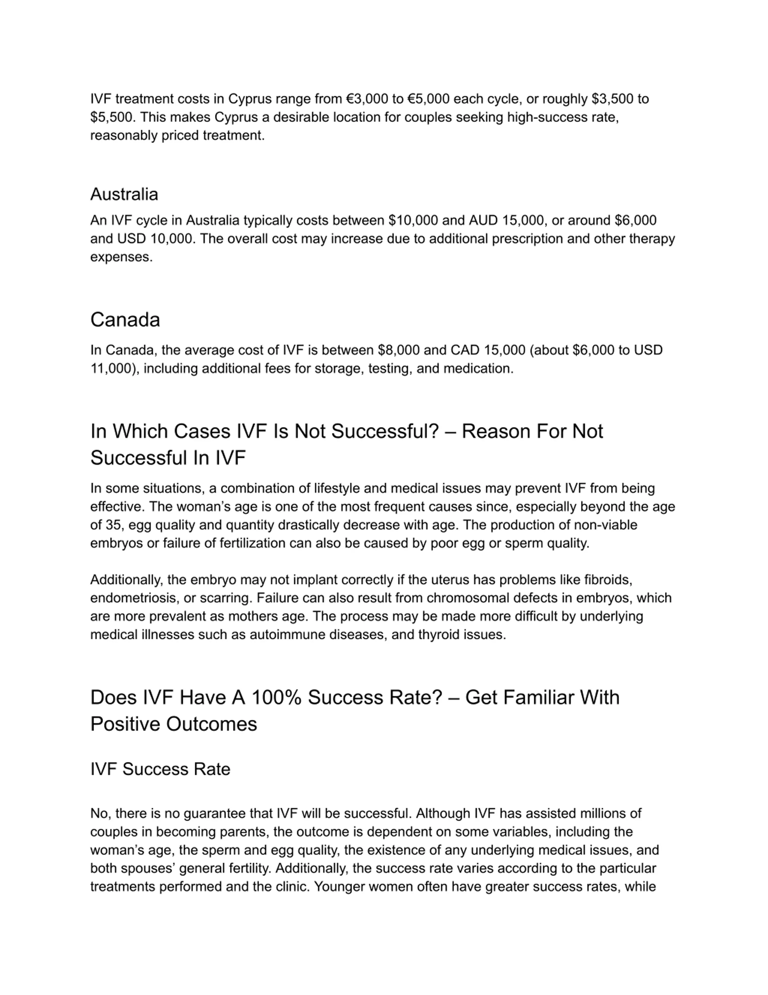 IVF treatment costs in Cyprus range from 3,000 to 5,000 each cycle, or roughly $3,500 to $5,500. This makes Cyprus a desirable location for couples seeking high-success rate, reasonably priced treatment. Australia An IVF cycle in Australia typically costs between $10,000 and AUD 15,000, or around $6,000 and USD 10,000. The overall cost may increase due to additional prescription and other therapy expenses. Canada In Canada, the average cost of IVF is between $8,000 and CAD 15,000 (about $6,000 to USD 11,000), including additional fees for storage, testing, and medication. In Which Cases IVF Is Not Successful? Reason For Not Successful In IVF In some situations, a combination of lifestyle and medical issues may prevent IVF from being effective. The woman s age is one of the most frequent causes since, especially beyond the age of 35, egg quality and quantity drastically decrease with age. The production of non-viable embryos or failure of fertilization can also be caused by poor egg or sperm quality. Additionally, the embryo may not implant correctly if the uterus has problems like fibroids, endometriosis, or scarring. Failure can also result from chromosomal defects in embryos, which are more prevalent as mothers age. The process may be made more difficult by underlying medical illnesses such as autoimmune diseases, and thyroid issues. Does IVF Have A 100% Success Rate? Get Familiar With Positive Outcomes IVF Success Rate No, there is no guarantee that IVF will be successful. Although IVF has assisted millions of couples in becoming parents, the outcome is dependent on some variables, including the woman s age, the sperm and egg quality, the existence of any underlying medical issues, and both spouses general fertility. Additionally, the success rate varies according to the particular treatments performed and the clinic. Younger women often have greater success rates, while