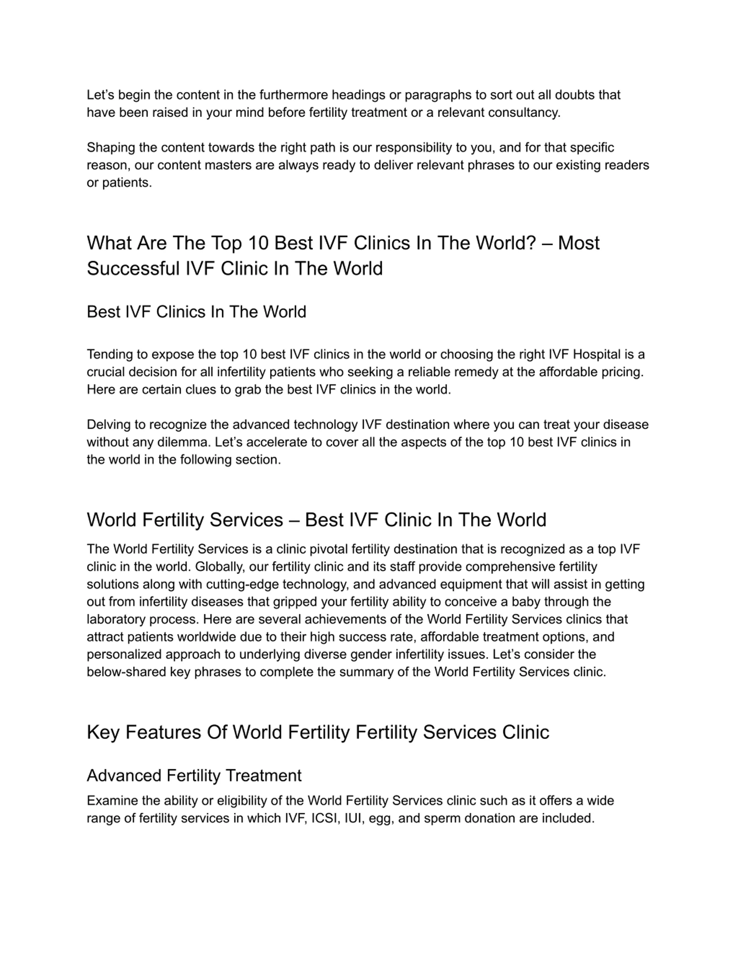 Lets begin the content in the furthermore headings or paragraphs to sort out all doubts that have been raised in your mind before fertility treatment or a relevant consultancy. Shaping the content towards the right path is our responsibility to you, and for that specific reason, our content masters are always ready to deliver relevant phrases to our existing readers or patients. What Are The Top 10 Best IVF Clinics In The World? Most Successful IVF Clinic In The World Best IVF Clinics In The World Tending to expose the top 10 best IVF clinics in the world or choosing the right IVF Hospital is a crucial decision for all infertility patients who seeking a reliable remedy at the affordable pricing. Here are certain clues to grab the best IVF clinics in the world. Delving to recognize the advanced technology IVF destination where you can treat your disease without any dilemma. Let s accelerate to cover all the aspects of the top 10 best IVF clinics in the world in the following section. World Fertility Services Best IVF Clinic In The World The World Fertility Services is a clinic pivotal fertility destination that is recognized as a top IVF clinic in the world. Globally, our fertility clinic and its staff provide comprehensive fertility solutions along with cutting-edge technology, and advanced equipment that will assist in getting out from infertility diseases that gripped your fertility ability to conceive a baby through the laboratory process. Here are several achievements of the World Fertility Services clinics that attract patients worldwide due to their high success rate, affordable treatment options, and personalized approach to underlying diverse gender infertility issues. Let s consider the below-shared key phrases to complete the summary of the World Fertility Services clinic. Key Features Of World Fertility Fertility Services Clinic Advanced Fertility Treatment Examine the ability or eligibility of the World Fertility Services clinic such as it offers a wide range of fertility services in which IVF, ICSI, IUI, egg, and sperm donation are included.