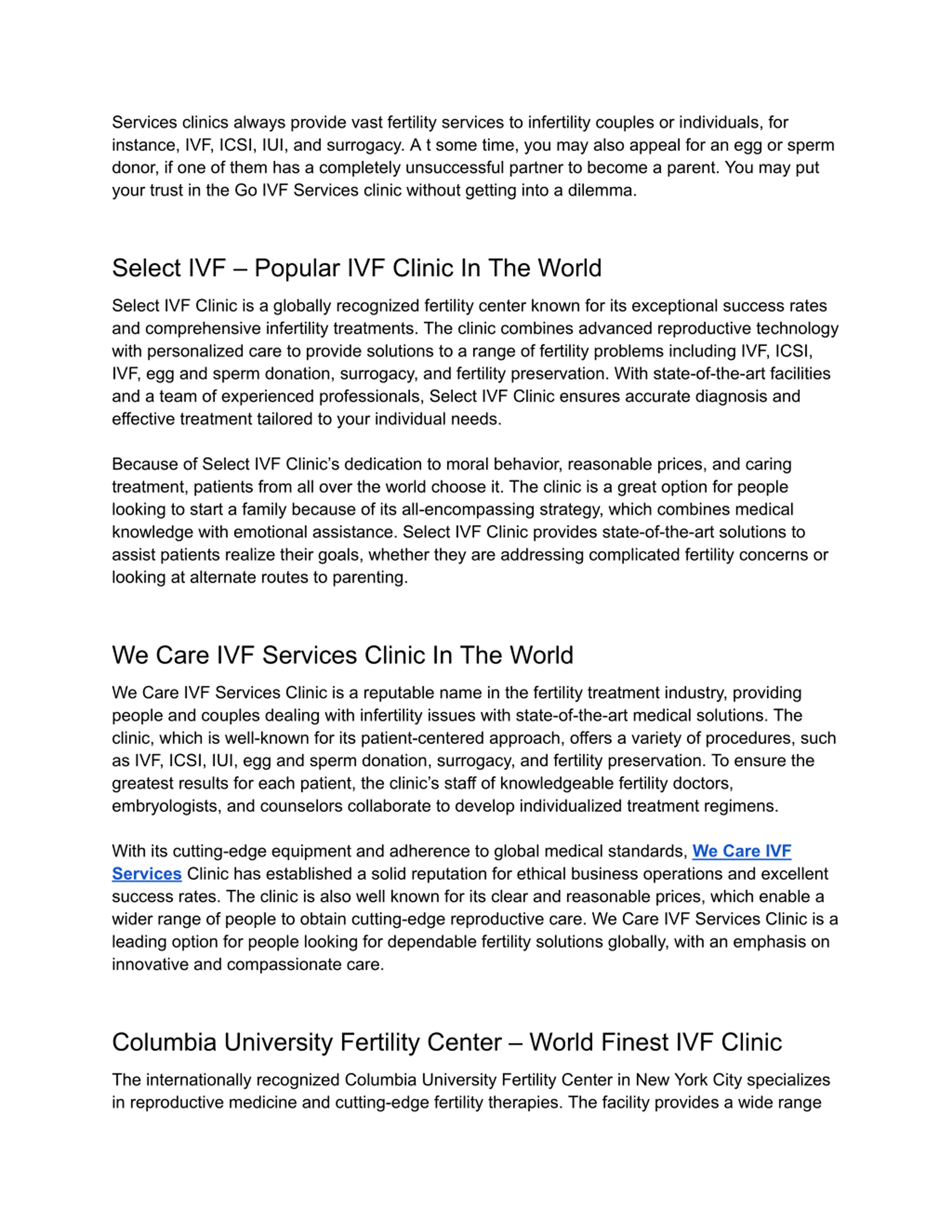 Services clinics always provide vast fertility services to infertility couples or individuals, for instance, IVF, ICSI, IUI, and surrogacy. A t some time, you may also appeal for an egg or sperm donor, if one of them has a completely unsuccessful partner to become a parent. You may put your trust in the Go IVF Services clinic without getting into a dilemma. Select IVF Popular IVF Clinic In The World Select IVF Clinic is a globally recognized fertility center known for its exceptional success rates and comprehensive infertility treatments. The clinic combines advanced reproductive technology with personalized care to provide solutions to a range of fertility problems including IVF, ICSI, IVF, egg and sperm donation, surrogacy, and fertility preservation. With state-of-the-art facilities and a team of experienced professionals, Select IVF Clinic ensures accurate diagnosis and effective treatment tailored to your individual needs. Because of Select IVF Clinic s dedication to moral behavior, reasonable prices, and caring treatment, patients from all over the world choose it. The clinic is a great option for people looking to start a family because of its all-encompassing strategy, which combines medical knowledge with emotional assistance. Select IVF Clinic provides state-of-the-art solutions to assist patients realize their goals, whether they are addressing complicated fertility concerns or looking at alternate routes to parenting. We Care IVF Services Clinic In The World We Care IVF Services Clinic is a reputable name in the fertility treatment industry, providing people and couples dealing with infertility issues with state-of-the-art medical solutions. The clinic, which is well-known for its patient-centered approach, offers a variety of procedures, such as IVF, ICSI, IUI, egg and sperm donation, surrogacy, and fertility preservation. To ensure the greatest results for each patient, the clinic s staff of knowledgeable fertility doctors, embryologists, and counselors collaborate to develop individualized treatment regimens. With its cutting-edge equipment and adherence to global medical standards, We Care IVF Services Clinic has established a solid reputation for ethical business operations and excellent success rates. The clinic is also well known for its clear and reasonable prices, which enable a wider range of people to obtain cutting-edge reproductive care. We Care IVF Services Clinic is a leading option for people looking for dependable fertility solutions globally, with an emphasis on innovative and compassionate care. Columbia University Fertility Center World Finest IVF Clinic The internationally recognized Columbia University Fertility Center in New York City specializes in reproductive medicine and cutting-edge fertility therapies. The facility provides a wide range
