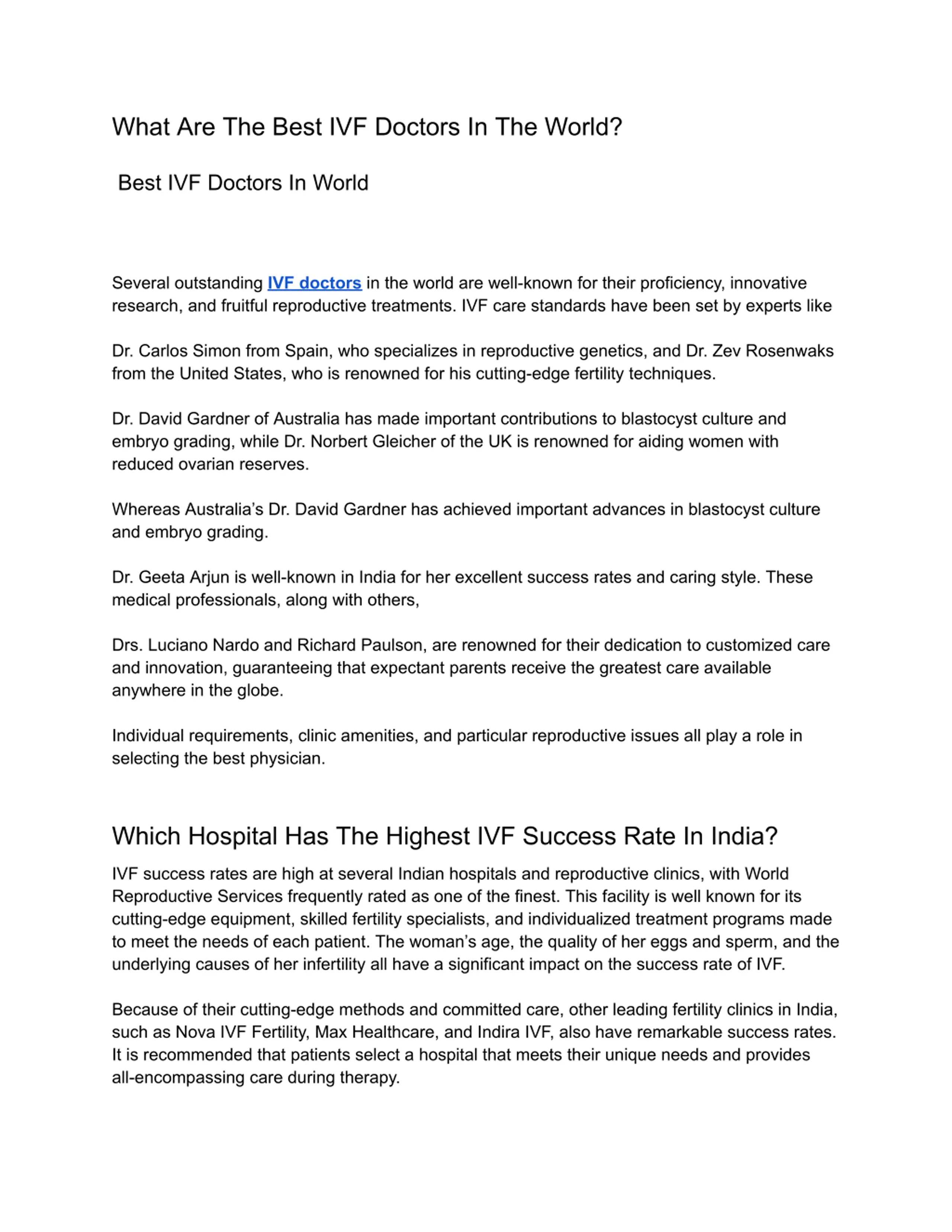 What Are The Best IVF Doctors In The World? Best IVF Doctors In World Several outstanding IVF doctors in the world are well-known for their proficiency, innovative research, and fruitful reproductive treatments. IVF care standards have been set by experts like Dr. Carlos Simon from Spain, who specializes in reproductive genetics, and Dr. Zev Rosenwaks from the United States, who is renowned for his cutting-edge fertility techniques. Dr. David Gardner of Australia has made important contributions to blastocyst culture and embryo grading, while Dr. Norbert Gleicher of the UK is renowned for aiding women with reduced ovarian reserves. Whereas Australia s Dr. David Gardner has achieved important advances in blastocyst culture and embryo grading. Dr. Geeta Arjun is well-known in India for her excellent success rates and caring style. These medical professionals, along with others, Drs. Luciano Nardo and Richard Paulson, are renowned for their dedication to customized care and innovation, guaranteeing that expectant parents receive the greatest care available anywhere in the globe. Individual requirements, clinic amenities, and particular reproductive issues all play a role in selecting the best physician. Which Hospital Has The Highest IVF Success Rate In India? IVF success rates are high at several Indian hospitals and reproductive clinics, with World Reproductive Services frequently rated as one of the finest. This facility is well known for its cutting-edge equipment, skilled fertility specialists, and individualized treatment programs made to meet the needs of each patient. The woman s age, the quality of her eggs and sperm, and the underlying causes of her infertility all have a significant impact on the success rate of IVF. Because of their cutting-edge methods and committed care, other leading fertility clinics in India, such as Nova IVF Fertility, Max Healthcare, and Indira IVF, also have remarkable success rates. It is recommended that patients select a hospital that meets their unique needs and provides all-encompassing care during therapy.