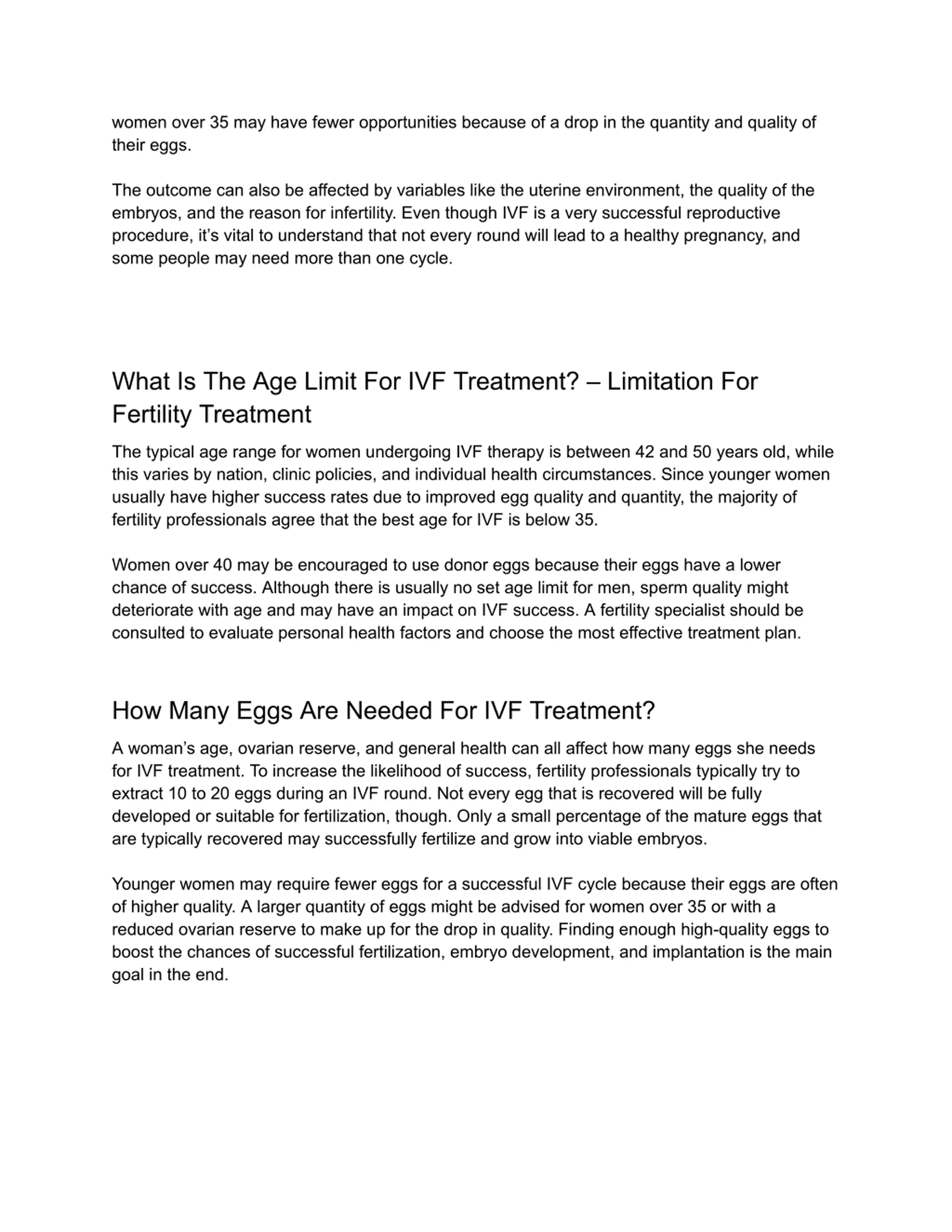 women over 35 may have fewer opportunities because of a drop in the quantity and quality of their eggs. The outcome can also be affected by variables like the uterine environment, the quality of the embryos, and the reason for infertility. Even though IVF is a very successful reproductive procedure, it s vital to understand that not every round will lead to a healthy pregnancy, and some people may need more than one cycle. What Is The Age Limit For IVF Treatment? Limitation For Fertility Treatment The typical age range for women undergoing IVF therapy is between 42 and 50 years old, while this varies by nation, clinic policies, and individual health circumstances. Since younger women usually have higher success rates due to improved egg quality and quantity, the majority of fertility professionals agree that the best age for IVF is below 35. Women over 40 may be encouraged to use donor eggs because their eggs have a lower chance of success. Although there is usually no set age limit for men, sperm quality might deteriorate with age and may have an impact on IVF success. A fertility specialist should be consulted to evaluate personal health factors and choose the most effective treatment plan. How Many Eggs Are Needed For IVF Treatment? A woman s age, ovarian reserve, and general health can all affect how many eggs she needs for IVF treatment. To increase the likelihood of success, fertility professionals typically try to extract 10 to 20 eggs during an IVF round. Not every egg that is recovered will be fully developed or suitable for fertilization, though. Only a small percentage of the mature eggs that are typically recovered may successfully fertilize and grow into viable embryos. Younger women may require fewer eggs for a successful IVF cycle because their eggs are often of higher quality. A larger quantity of eggs might be advised for women over 35 or with a reduced ovarian reserve to make up for the drop in quality. Finding enough high-quality eggs to boost the chances of successful fertilization, embryo development, and implantation is the main goal in the end.