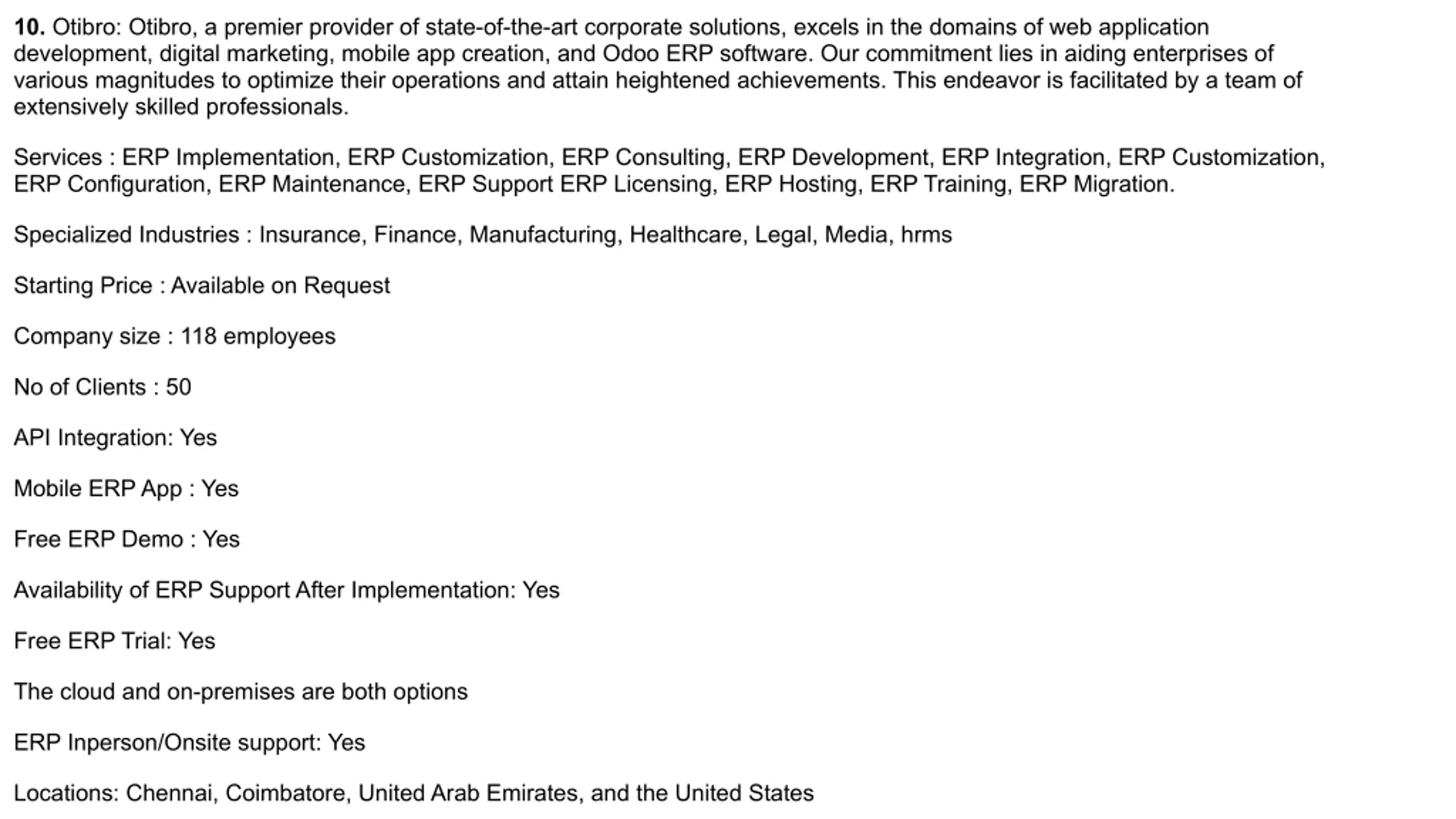 10. Otibro: Otibro, a premier provider of state-of-the-art corporate solutions, excels in the domains of web application development, digital marketing, mobile app creation, and Odoo ERP software. Our commitment lies in aiding enterprises of various magnitudes to optimize their operations and attain heightened achievements. This endeavor is facilitated by a team of extensively skilled professionals. Services : ERP Implementation, ERP Customization, ERP Consulting, ERP Development, ERP Integration, ERP Customization, ERP Configuration, ERP Maintenance, ERP Support ERP Licensing, ERP Hosting, ERP Training, ERP Migration. Specialized Industries : Insurance, Finance, Manufacturing, Healthcare, Legal, Media, hrms Starting Price : Available on Request Company size : 118 employees No of Clients : 50 API Integration: Yes Mobile ERP App : Yes Free ERP Demo : Yes Availability of ERP Support After Implementation: Yes Free ERP Trial: Yes The cloud and on-premises are both options ERP Inperson/Onsite support: Yes Locations: Chennai, Coimbatore, United Arab Emirates, and the United States
