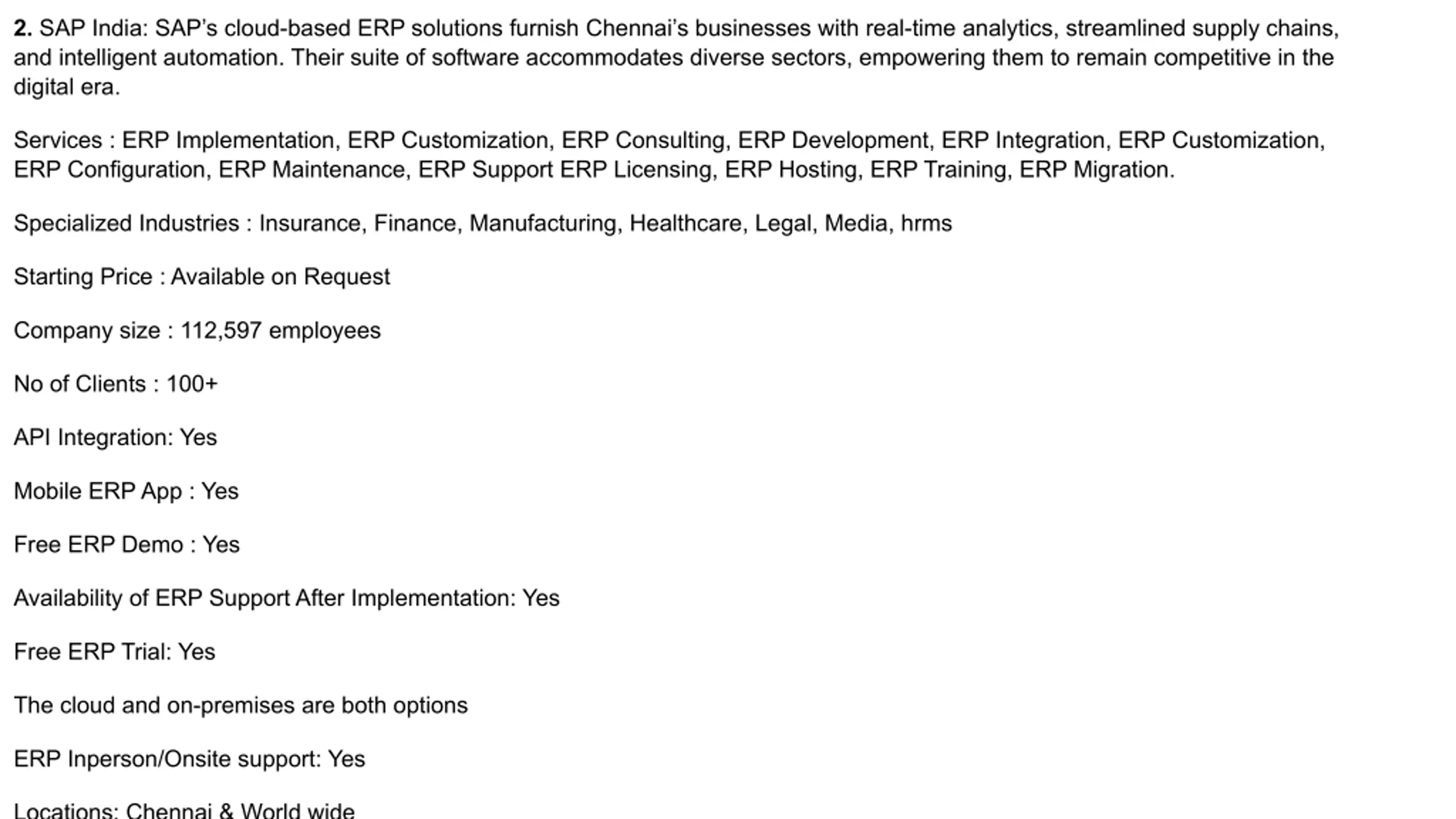 2. SAP India: SAPs cloud-based ERP solutions furnish Chennais businesses with real-time analytics, streamlined supply chains, and intelligent automation. Their suite of software accommodates diverse sectors, empowering them to remain competitive in the digital era. Services : ERP Implementation, ERP Customization, ERP Consulting, ERP Development, ERP Integration, ERP Customization, ERP Configuration, ERP Maintenance, ERP Support ERP Licensing, ERP Hosting, ERP Training, ERP Migration. Specialized Industries : Insurance, Finance, Manufacturing, Healthcare, Legal, Media, hrms Starting Price : Available on Request Company size : 112,597 employees No of Clients : 100+ API Integration: Yes Mobile ERP App : Yes Free ERP Demo : Yes Availability of ERP Support After Implementation: Yes Free ERP Trial: Yes The cloud and on-premises are both options ERP Inperson/Onsite support: Yes Locations: Chennai & World wide