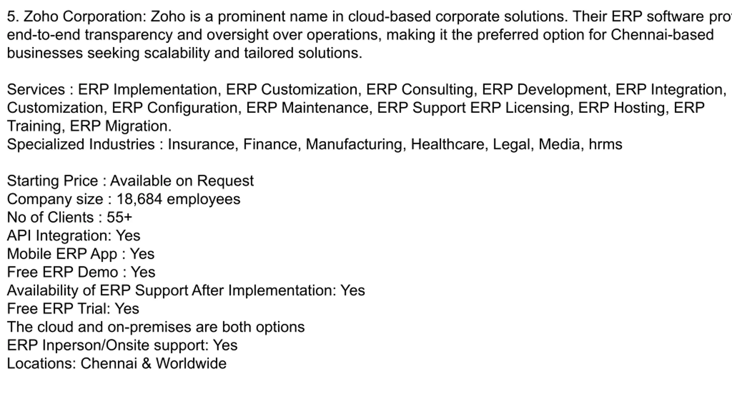5. Zoho Corporation: Zoho is a prominent name in cloud-based corporate solutions. Their ERP software provides end-to-end transparency and oversight over operations, making it the preferred option for Chennai-based businesses seeking scalability and tailored solutions. Services : ERP Implementation, ERP Customization, ERP Consulting, ERP Development, ERP Integration, ERP Customization, ERP Configuration, ERP Maintenance, ERP Support ERP Licensing, ERP Hosting, ERP Training, ERP Migration. Specialized Industries : Insurance, Finance, Manufacturing, Healthcare, Legal, Media, hrms Starting Price : Available on Request Company size : 18,684 employees No of Clients : 55+ API Integration: Yes Mobile ERP App : Yes Free ERP Demo : Yes Availability of ERP Support After Implementation: Yes Free ERP Trial: Yes The cloud and on-premises are both options ERP Inperson/Onsite support: Yes Locations: Chennai & Worldwide